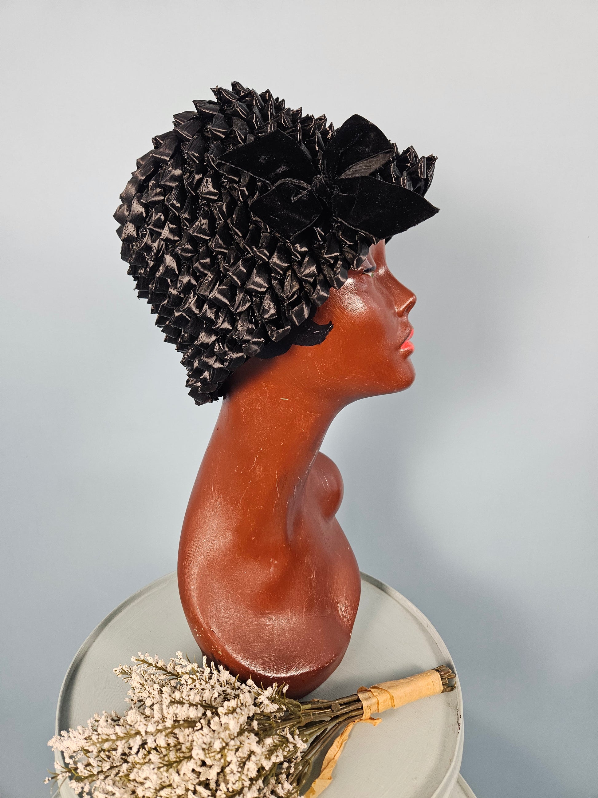 At the front, a black velvet ribbon accent provides a refined contrast to the straw, giving the hat a timeless, polished finish. Finished inside with an original union tag, this piece reflects quality mid-century craftsmanship and American-made heritage.