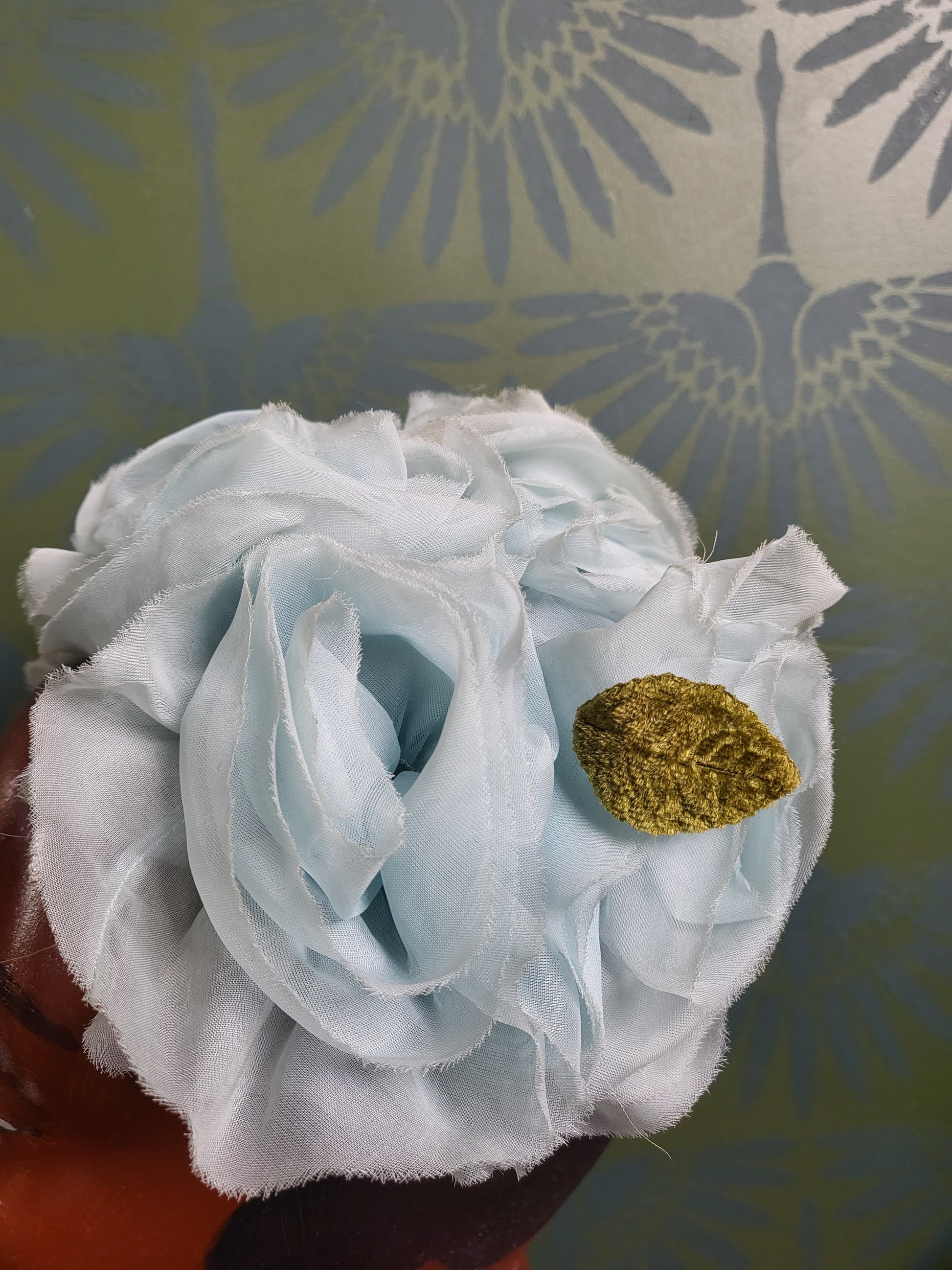 HAT6 - Vintage 1950s-1960s Pale Baby Blue Rosette and Olive Green Velvet Leaf Detail Crescent Topper