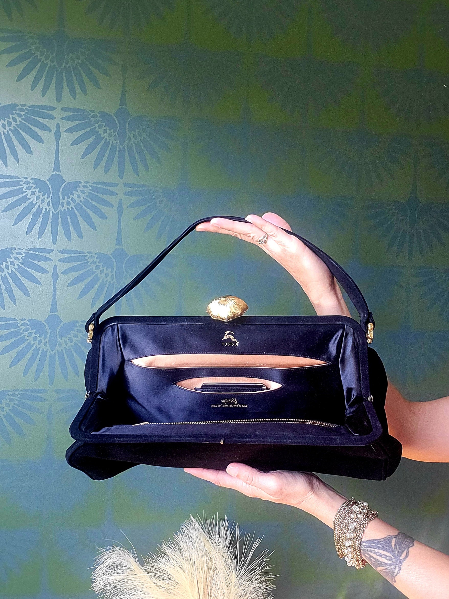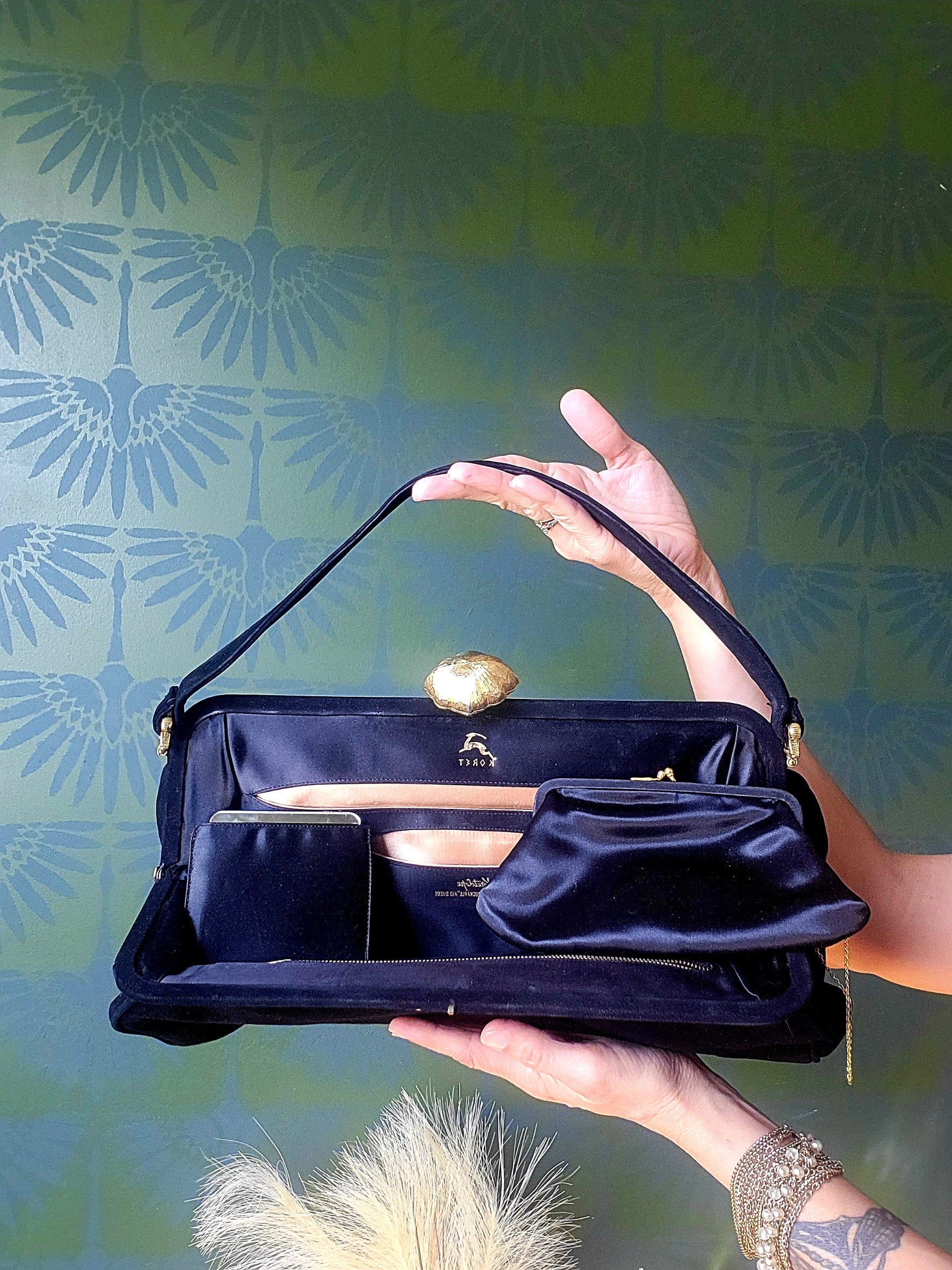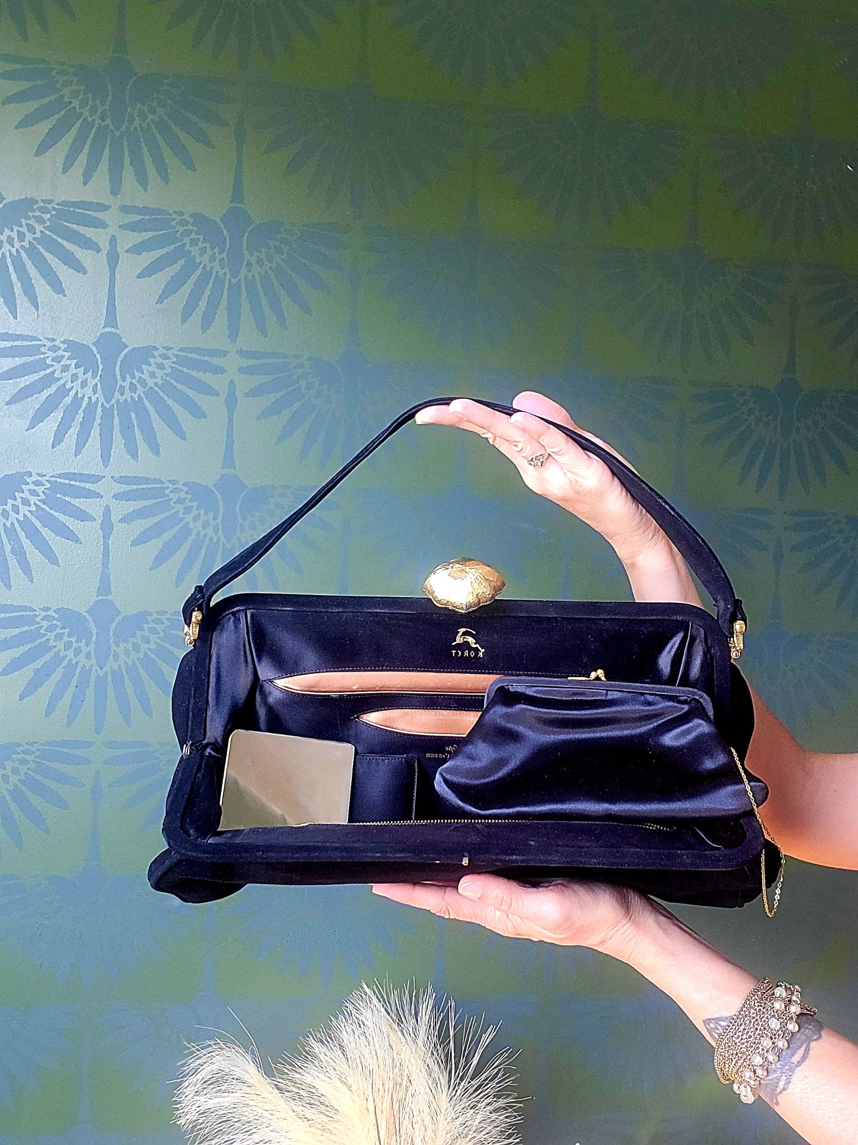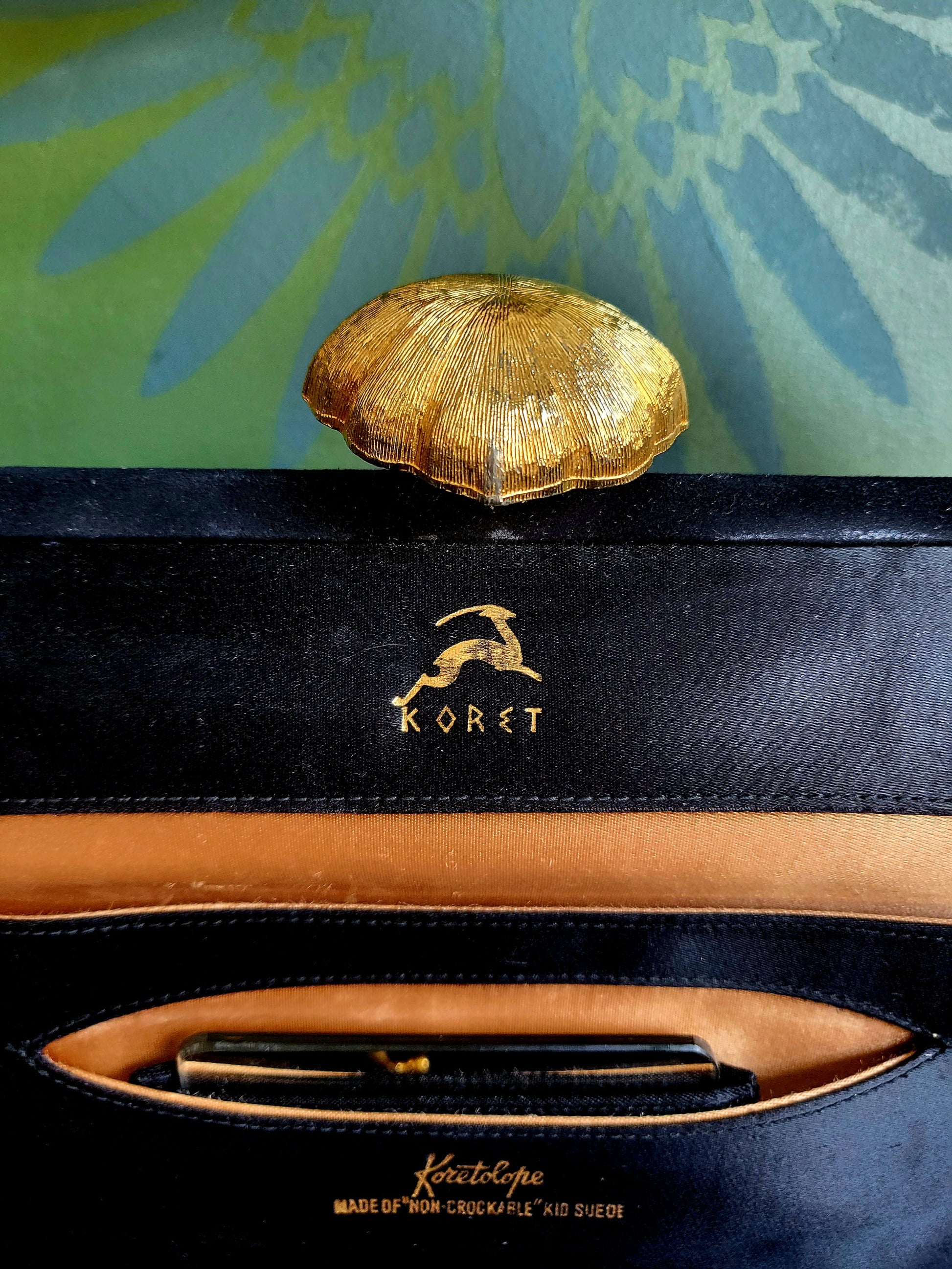 This vintage Koret Koretolope is in excellent condition and features non-crockable kid black suede, large golden shell shaped clasp, top handle, champagne colored satin lining, 2 open pockets and 1 zipper pocket, satin coin purse with chain linkage, and compact mirror encased in a black satin pouch.