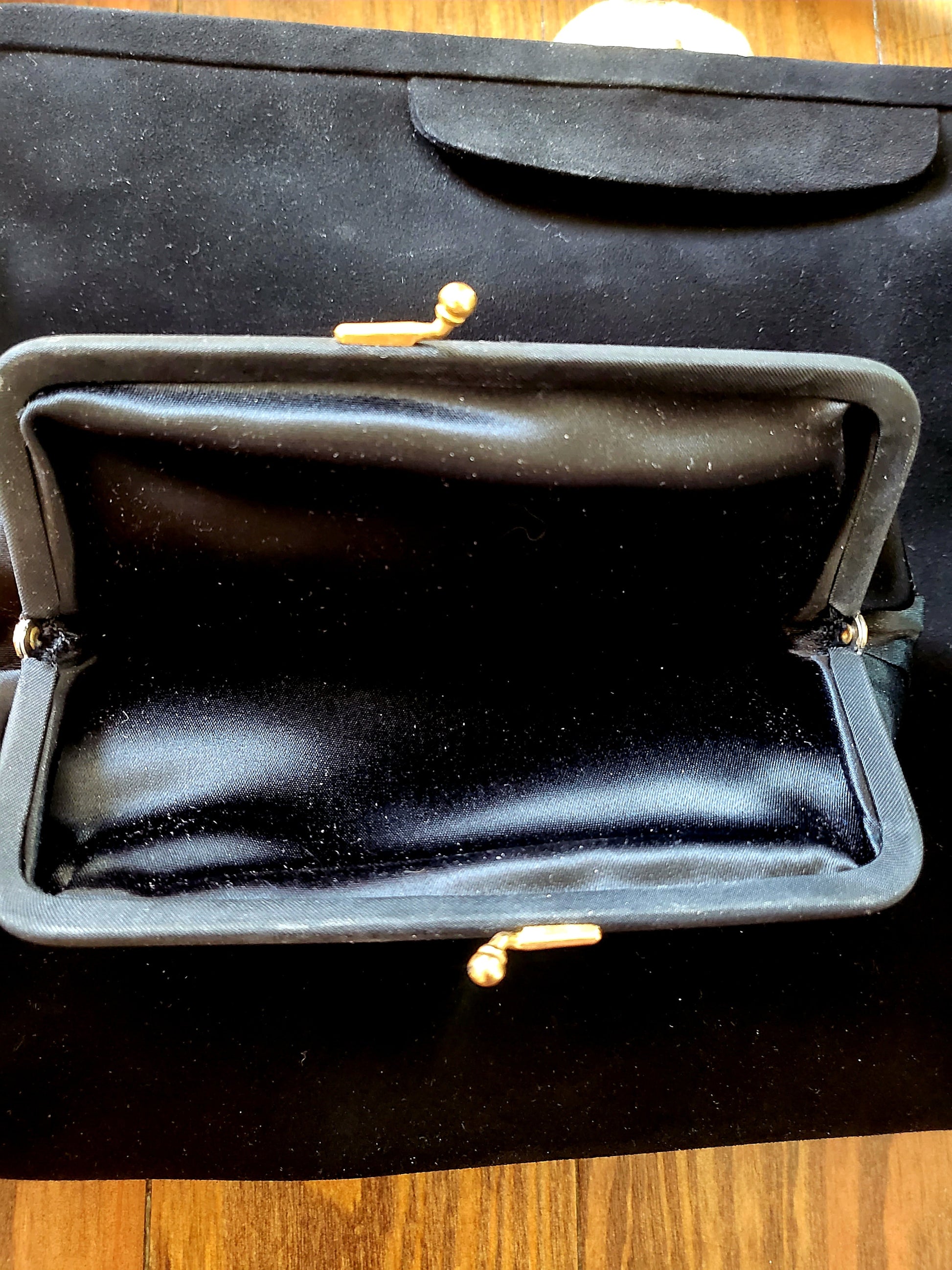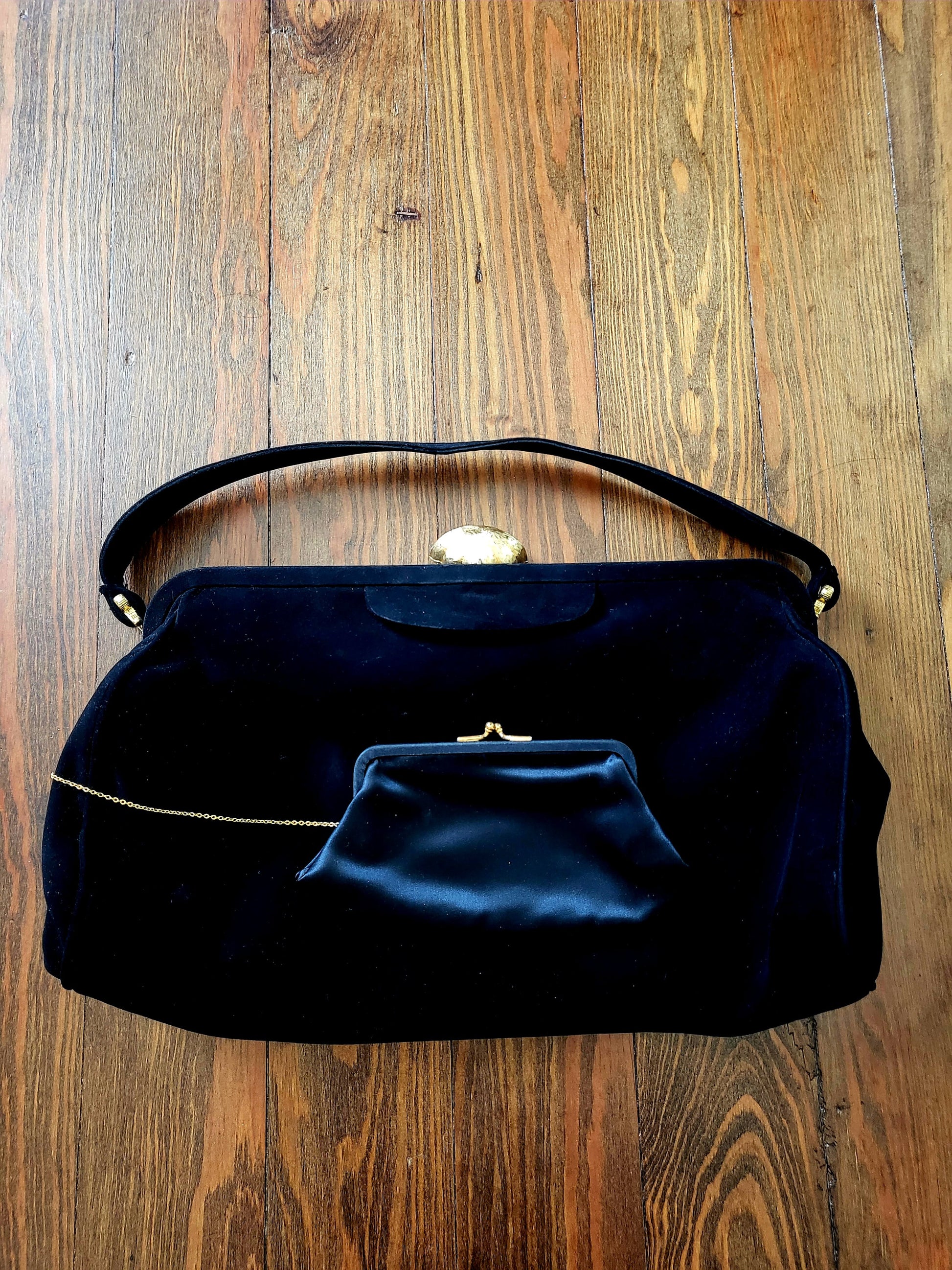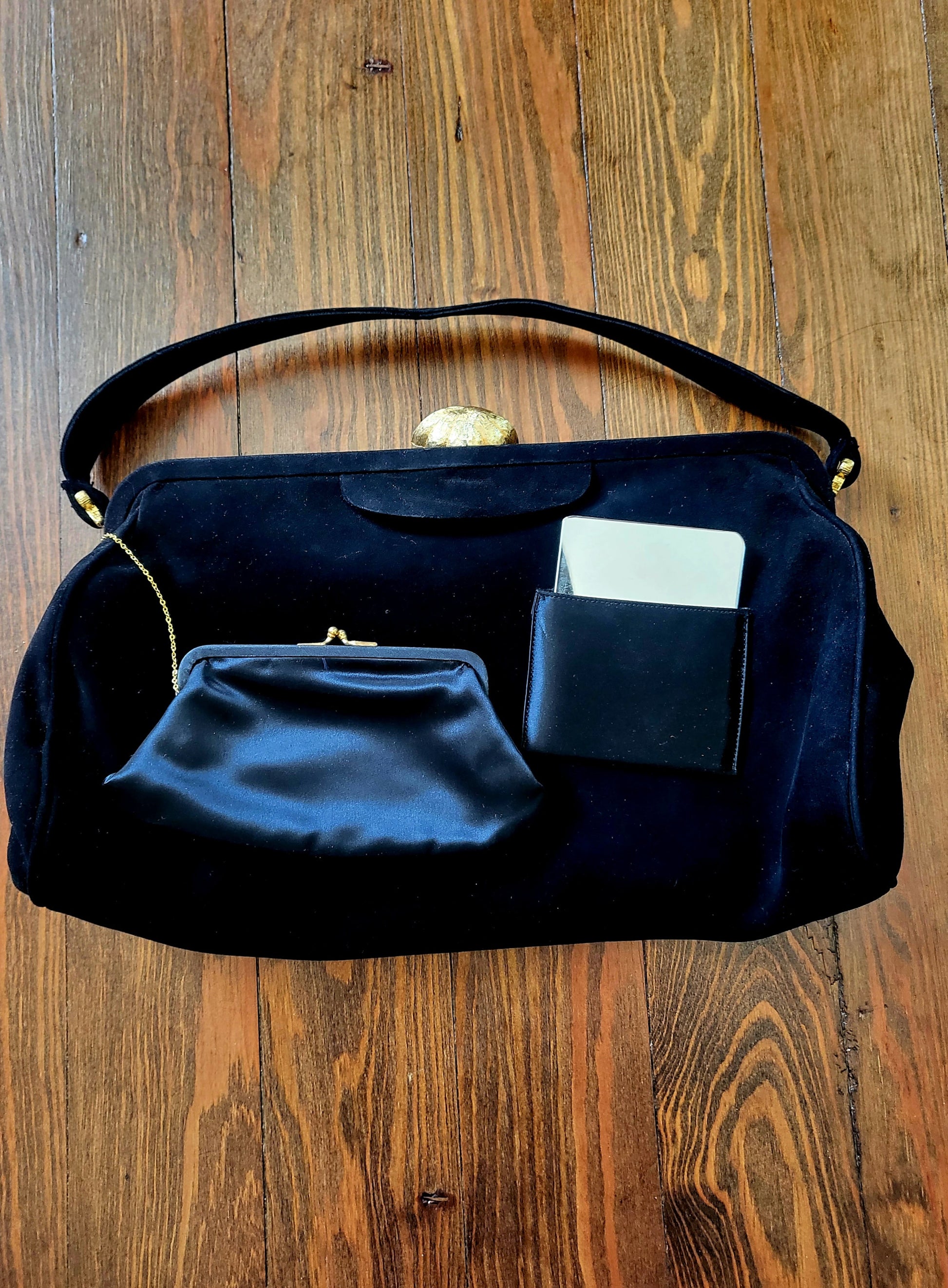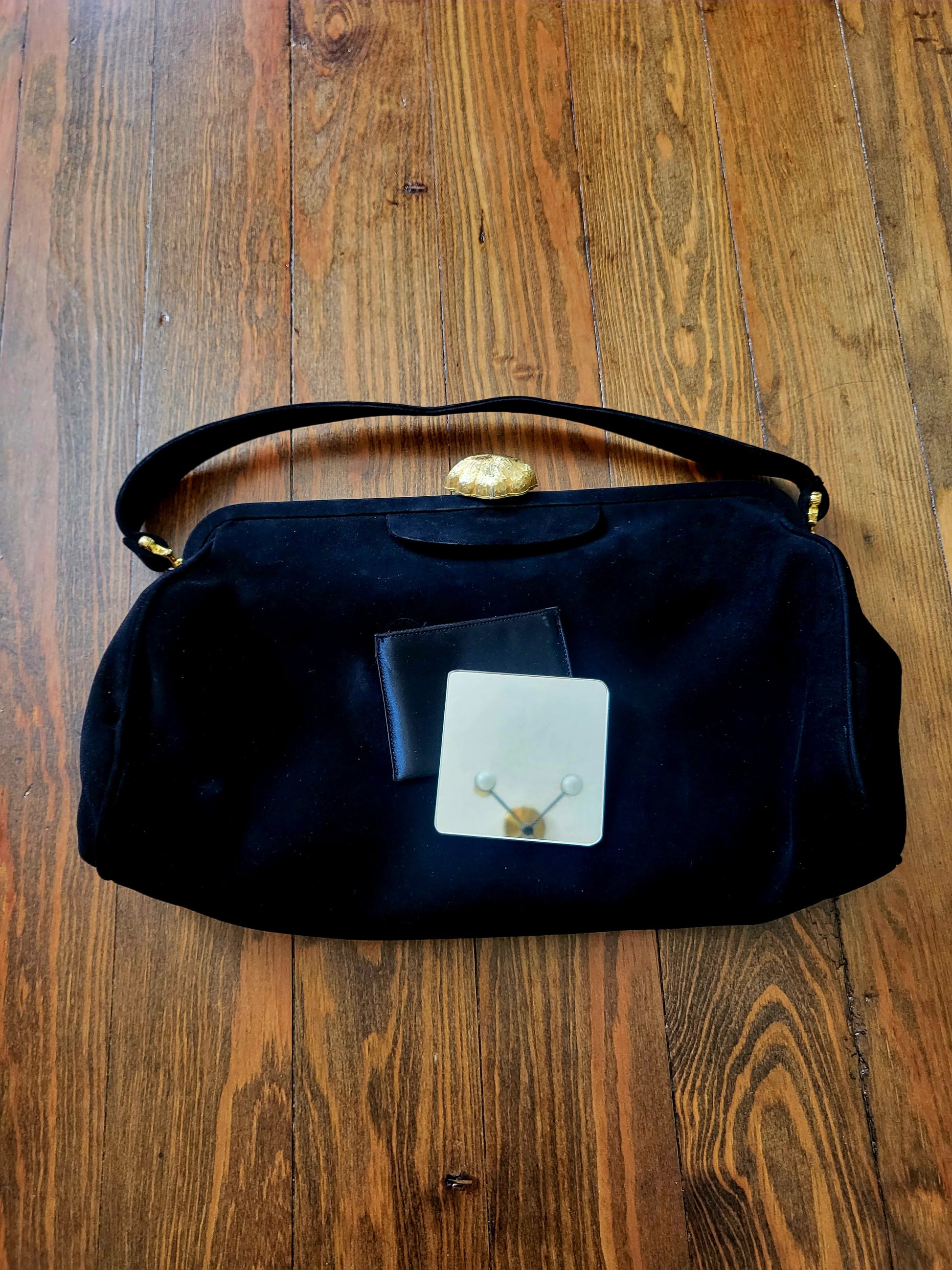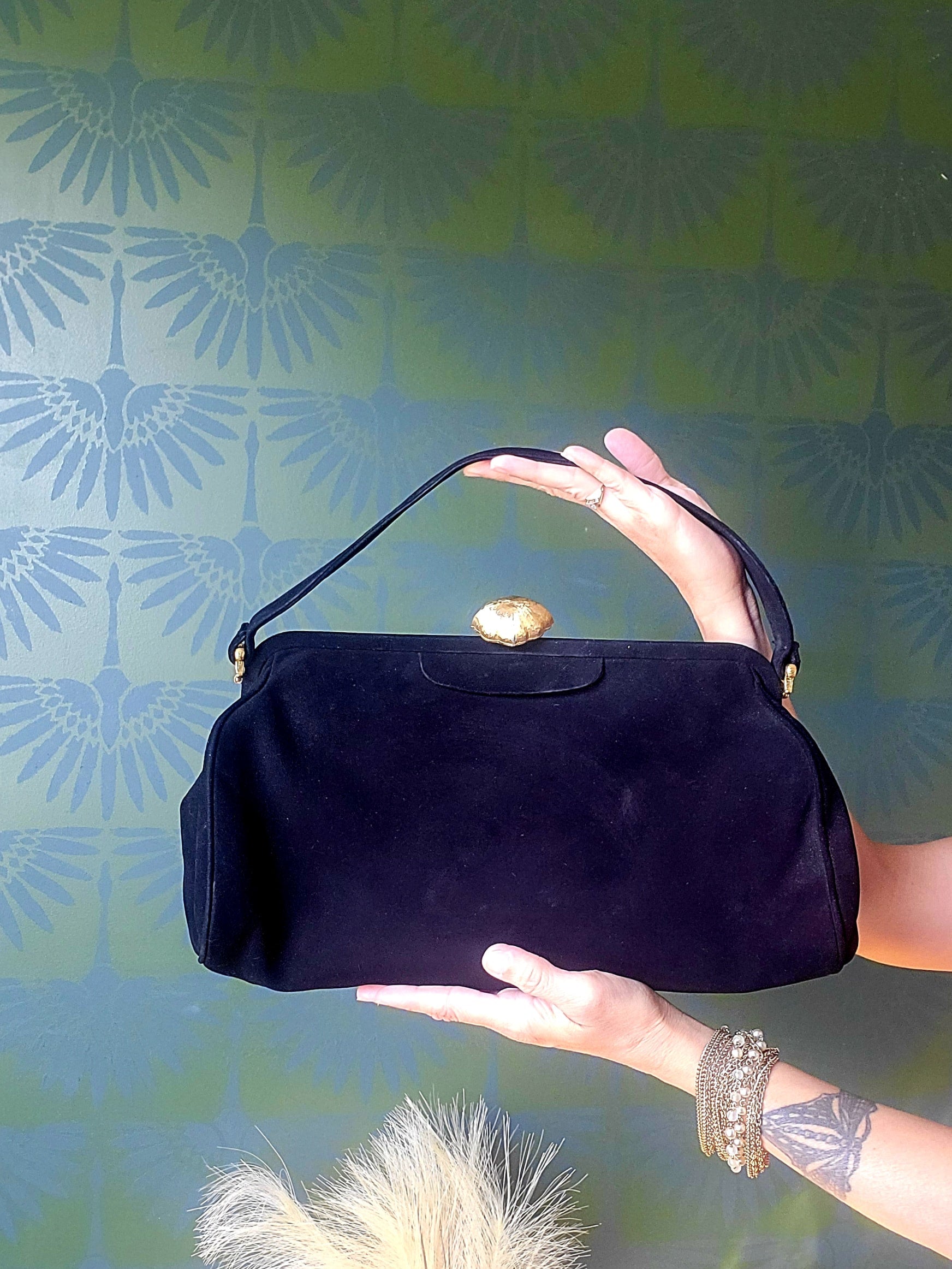 This vintage Koret Koretolope is in excellent condition and features non-crockable kid black suede, large golden shell shaped clasp, top handle, champagne colored satin lining, 2 open pockets and 1 zipper pocket, satin coin purse with chain linkage, and compact mirror encased in a black satin pouch.