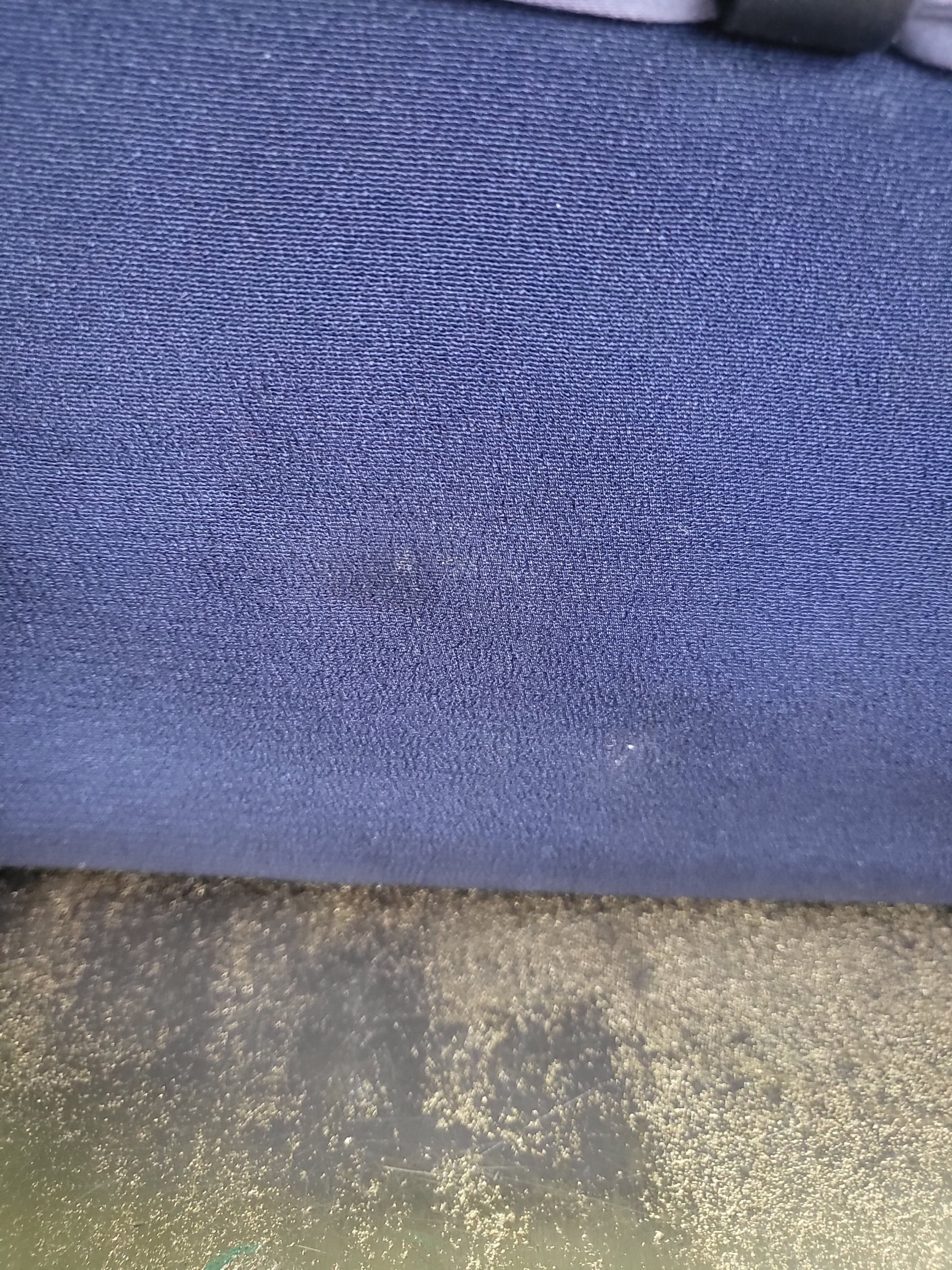 Imperfections: The cream colored satin lining has a few stains. The exterior fabric has a small hole on the side and a couple small stains.