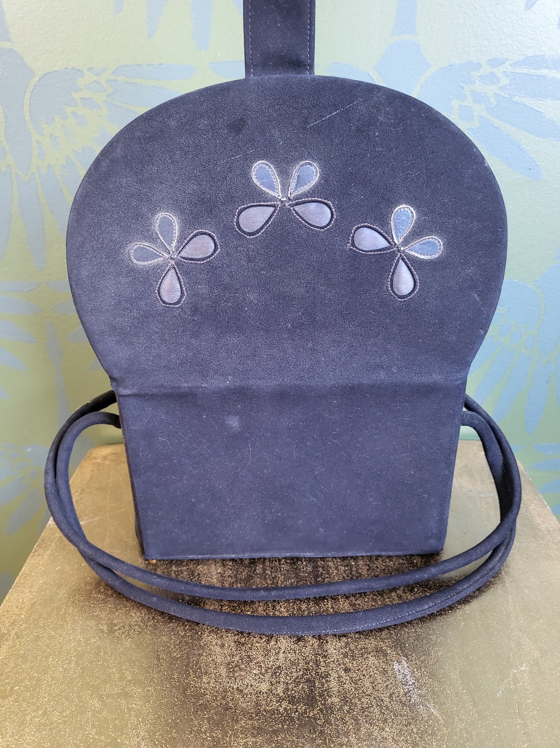 This vintage handbag features petal accents on the lid, navy satin lining, and brass bumpers on the bottom. The bag is in great shape except for slight wear from age, see pictures.