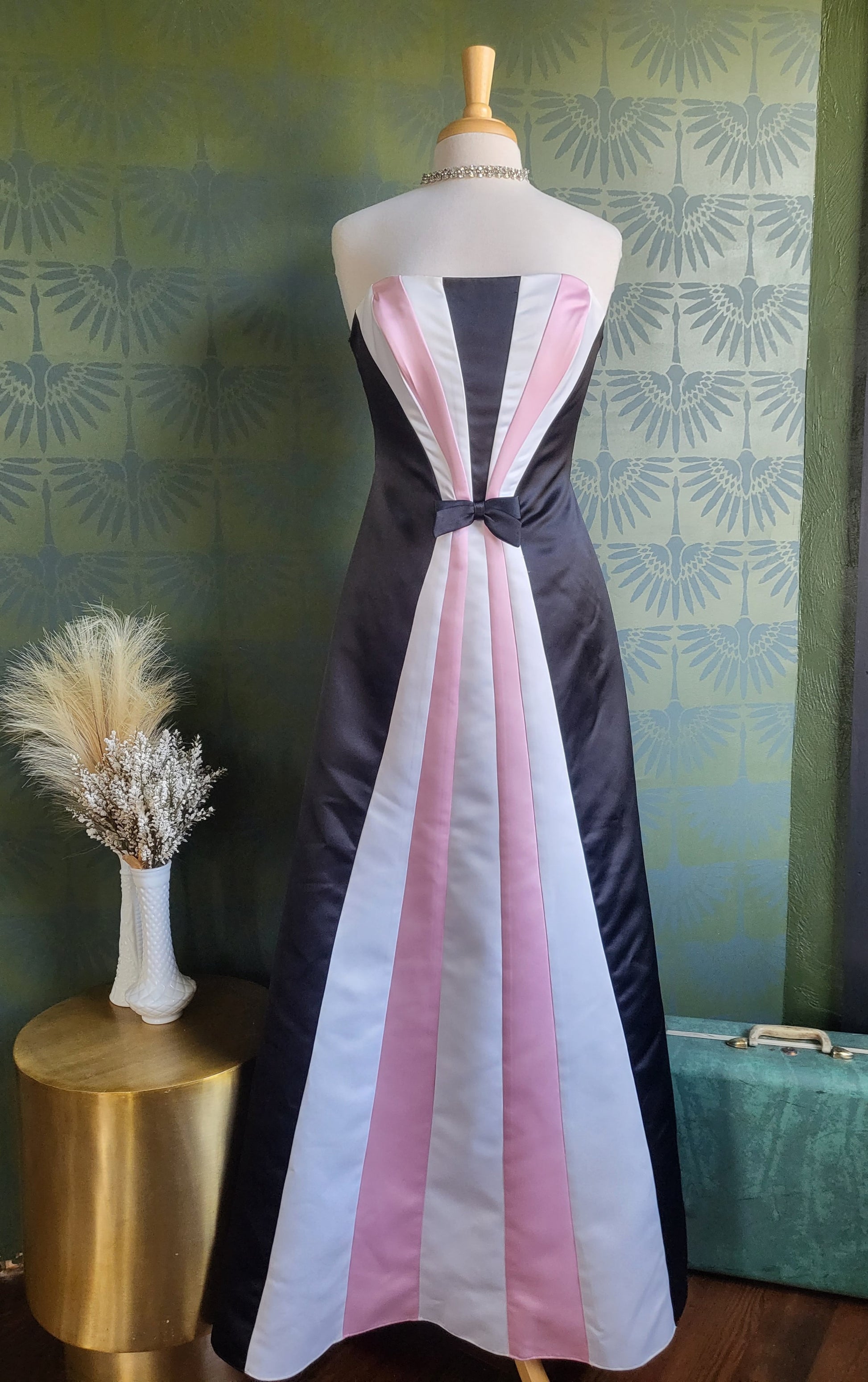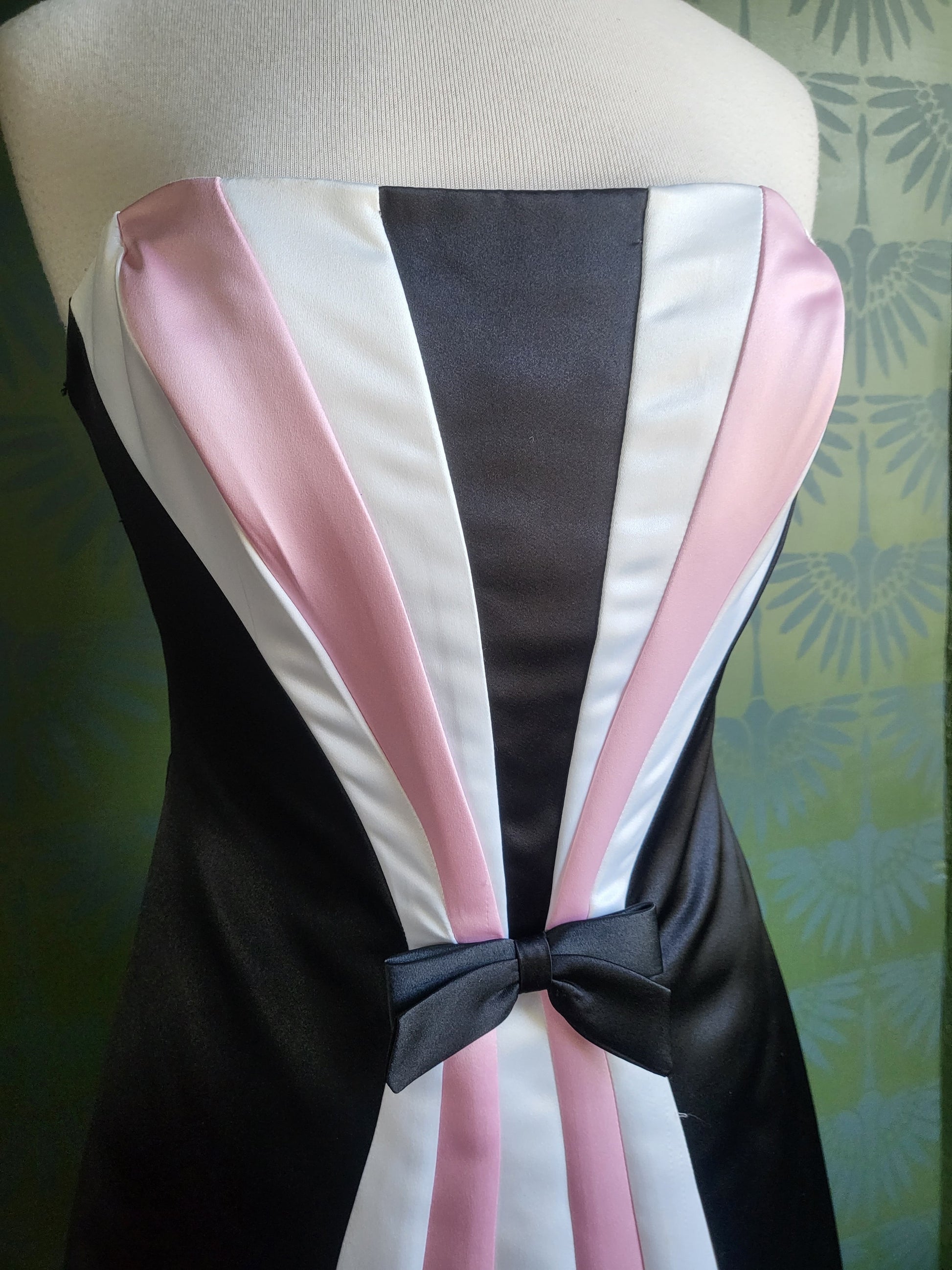 - Pink and white striped front panel on black satin shell creates an hour glass silhouette