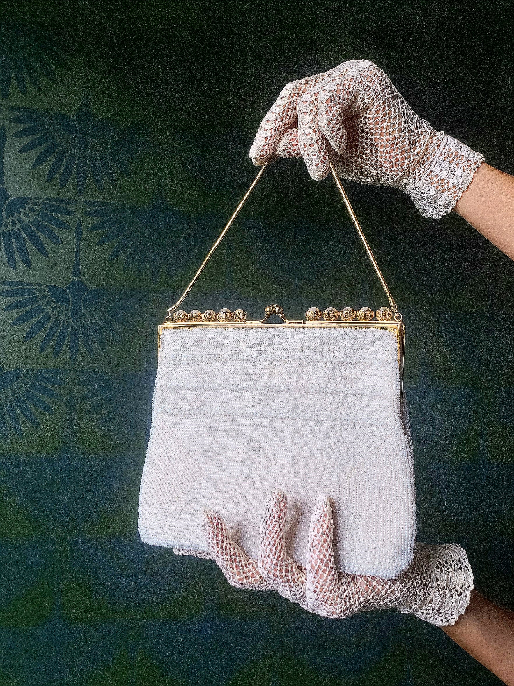 Vintage 1950's-1960's Ivory Beaded Evening Bag w/ Faux Pearl Trim