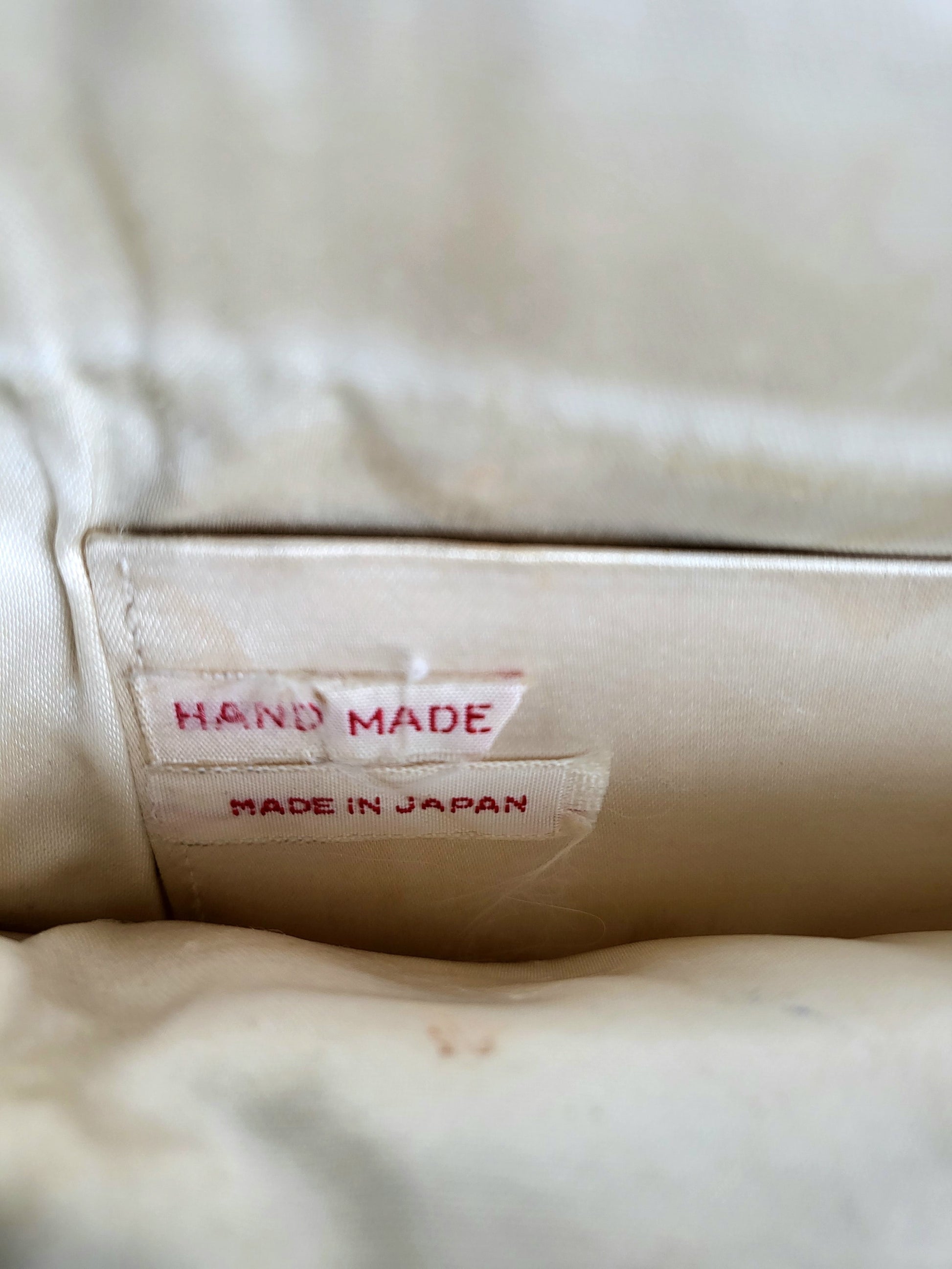 We just adore these micro-beaded evening bags! This was hand crafted in Japan and features faux peals encrusted in golden filigree along the top of the frame....topped off with a golden kiss lock clasp and golden snake chain handle
