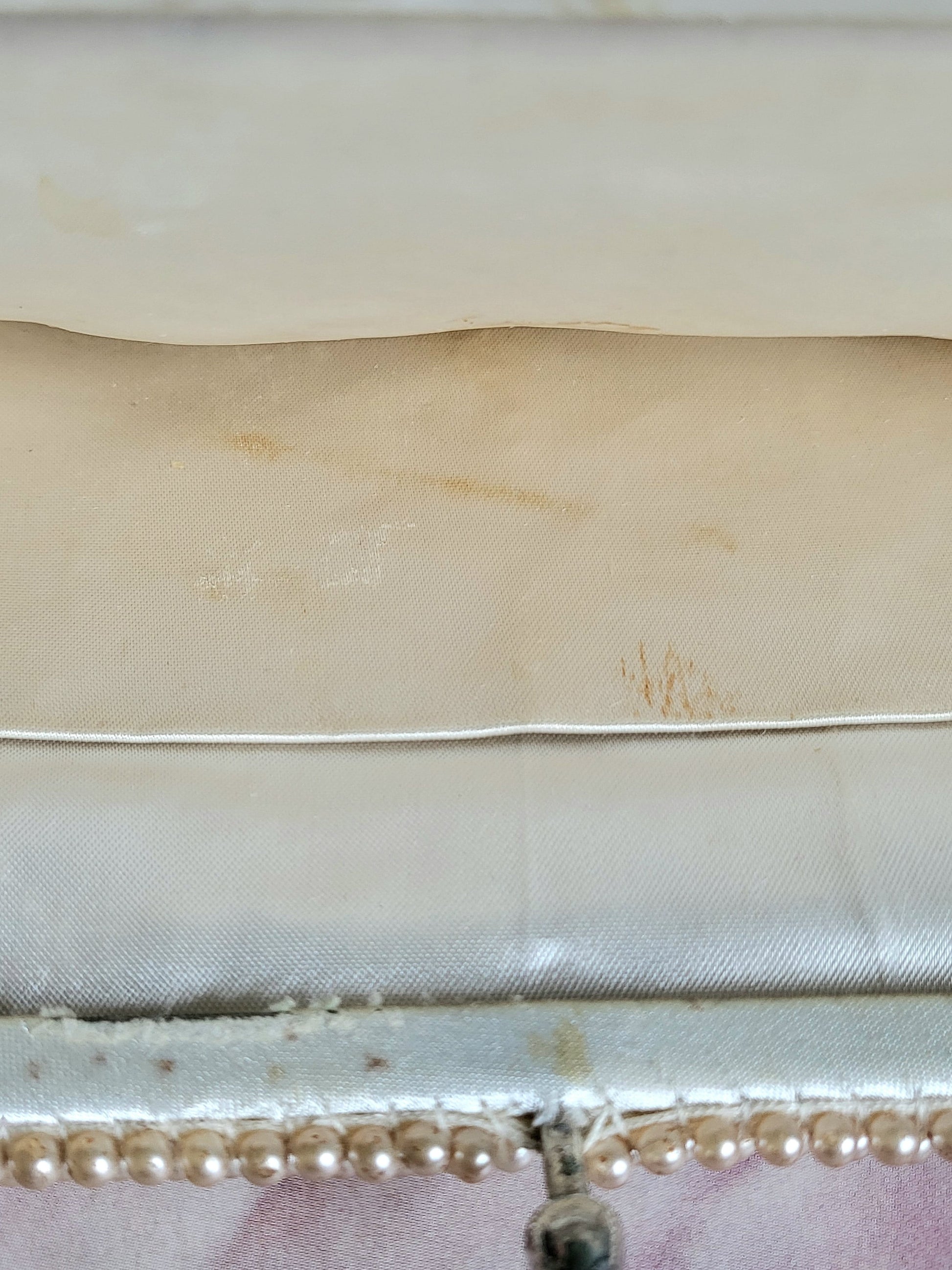 Blemishes: No major blemishes but may show signs of general wear due to age. Slight staining on the inner lining and a few beads missing along the exterior seam.