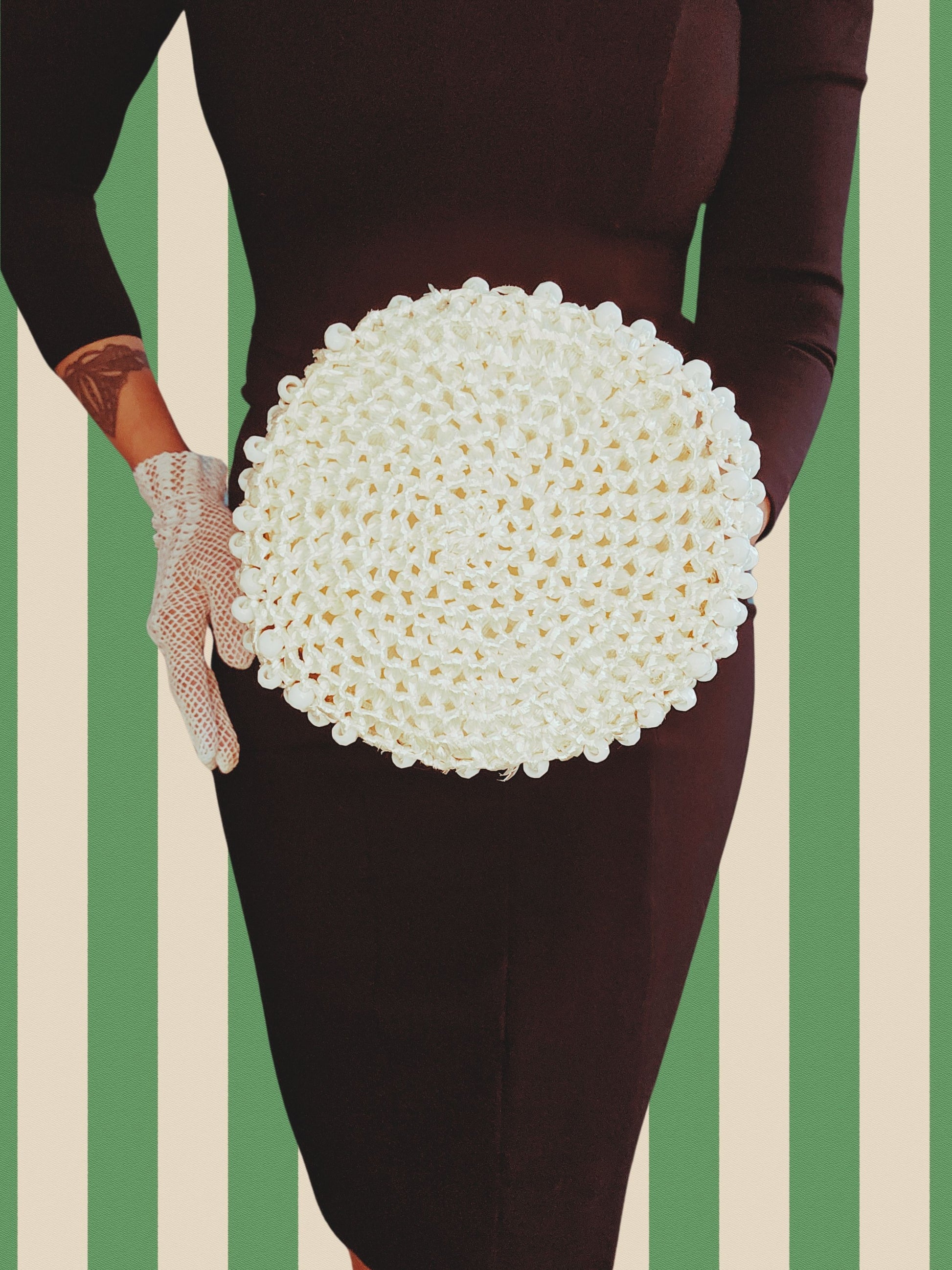 Vintage 1950's "Le Jule" White Beaded Straw Accordion Top Bag