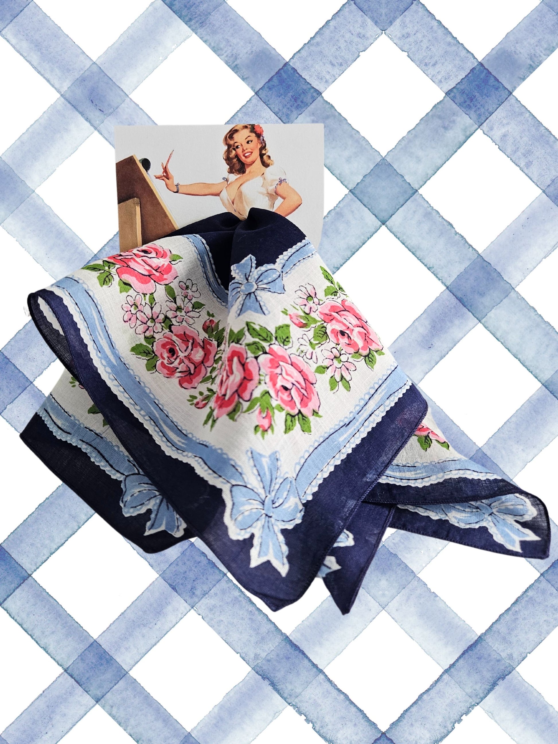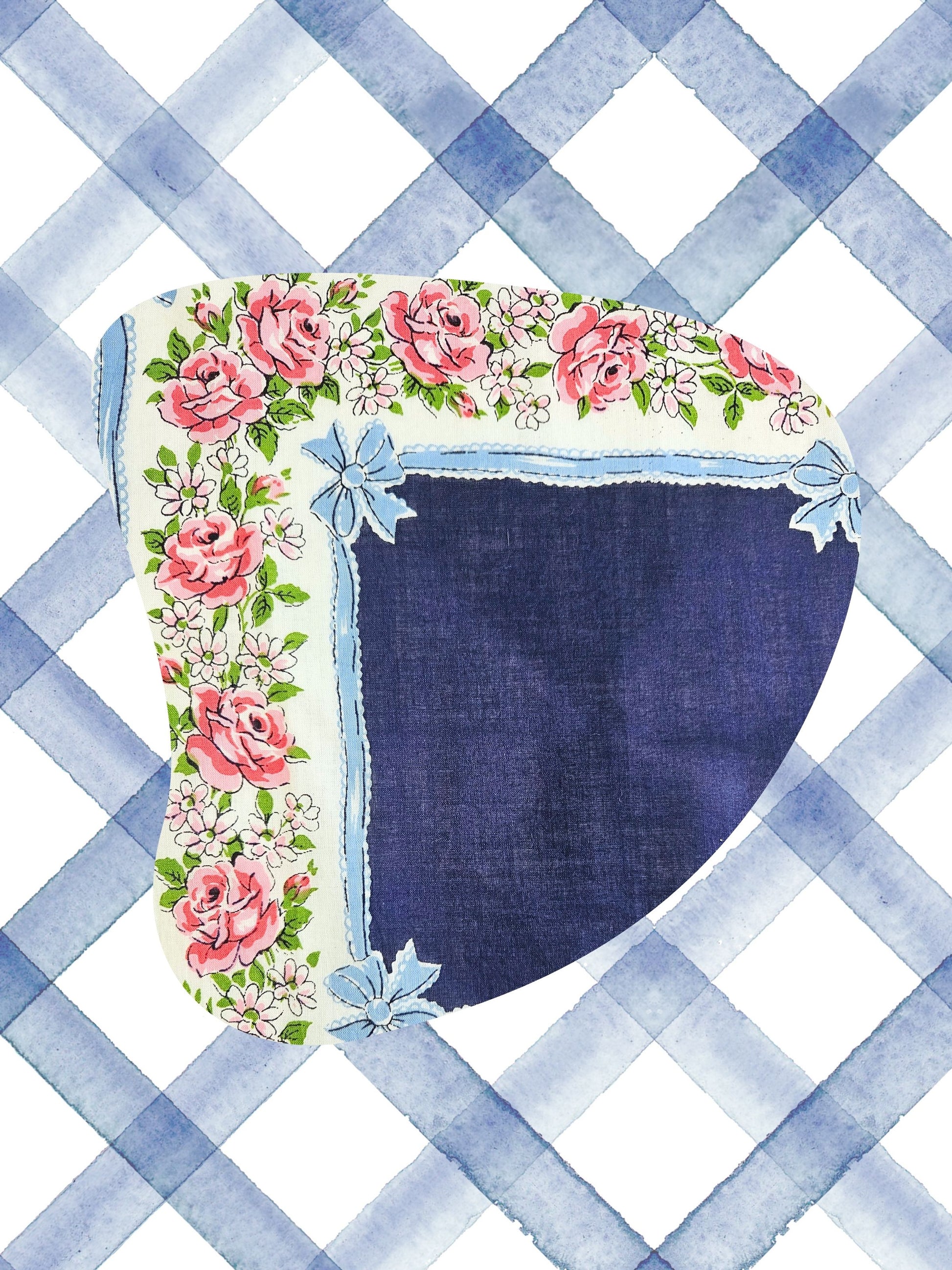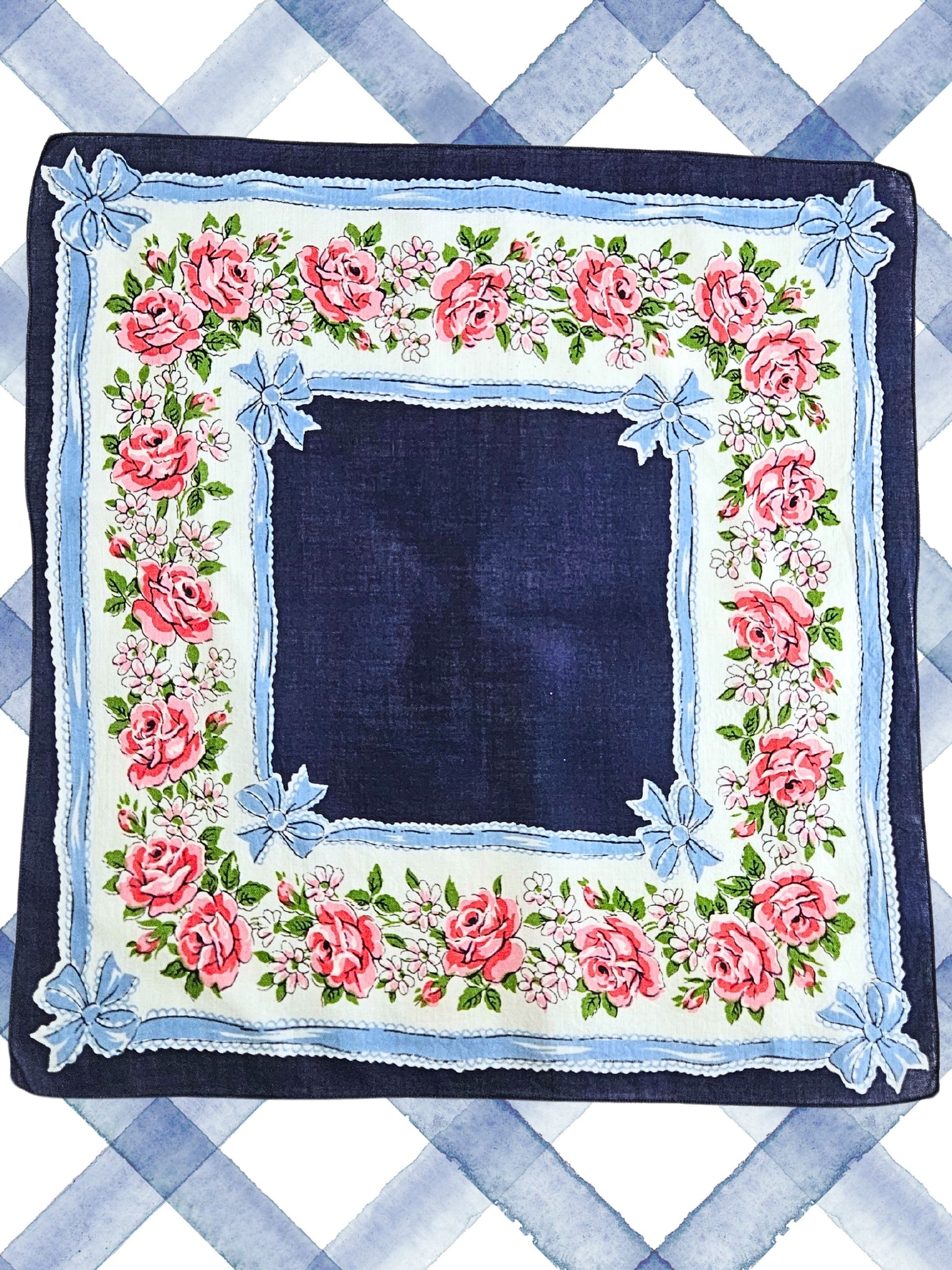 Vintage Handkerchief Square - Blue Ribbon & Pink Floral