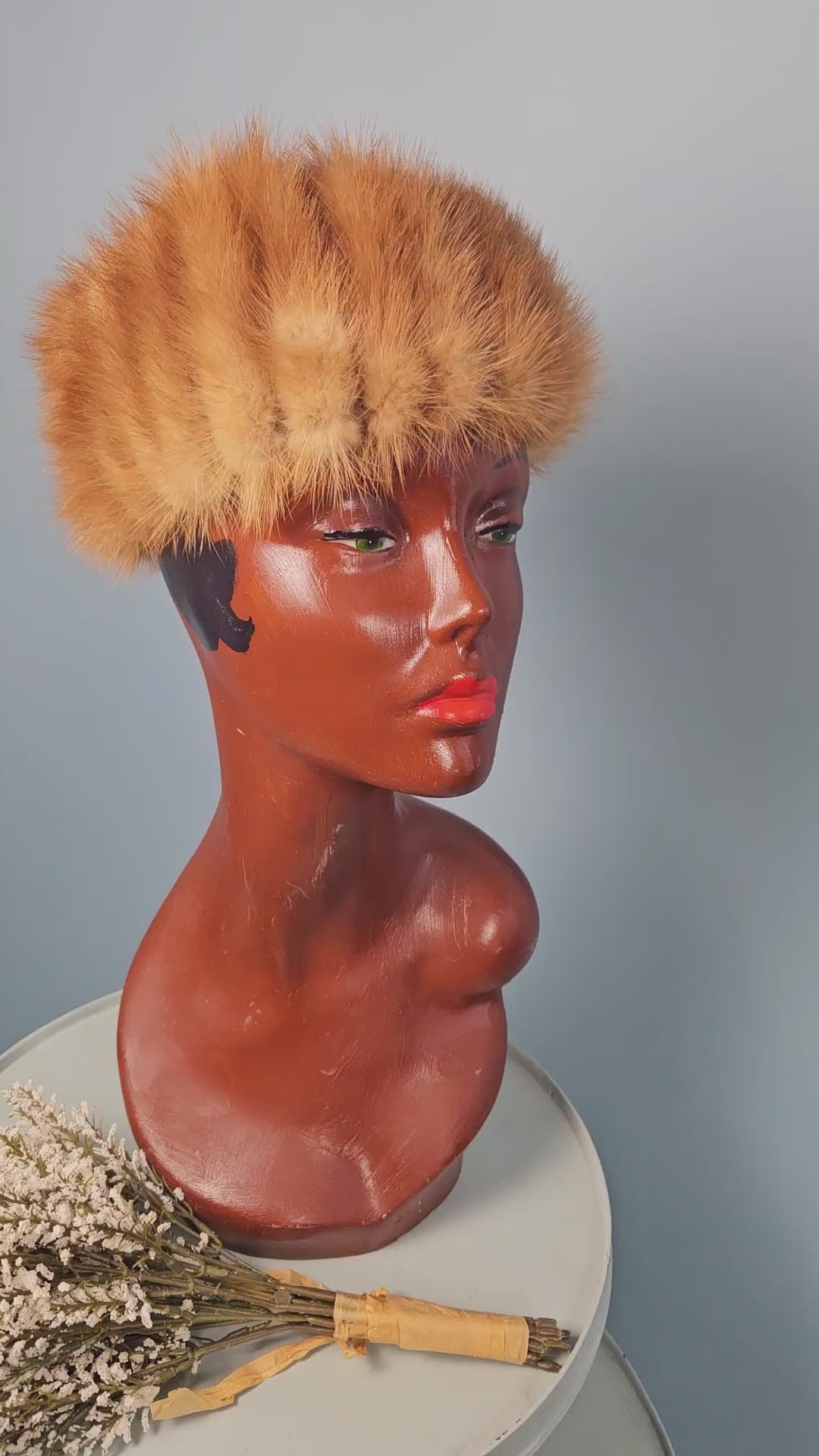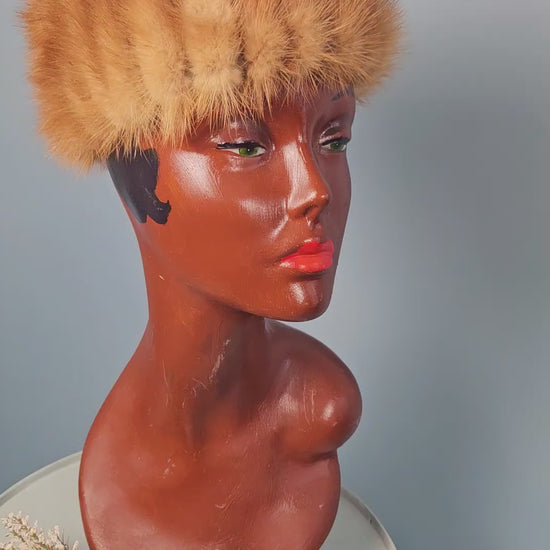 An elegant example of mid-century millinery, this authentic 1940s–1950s pillbox hat is crafted from sumptuous honey-toned mink pelt, prized for its dense, velvety texture and luminous natural sheen. The rich warm hue—somewhere between honey and toasted caramel—captures the understated luxury that defined post-war couture.