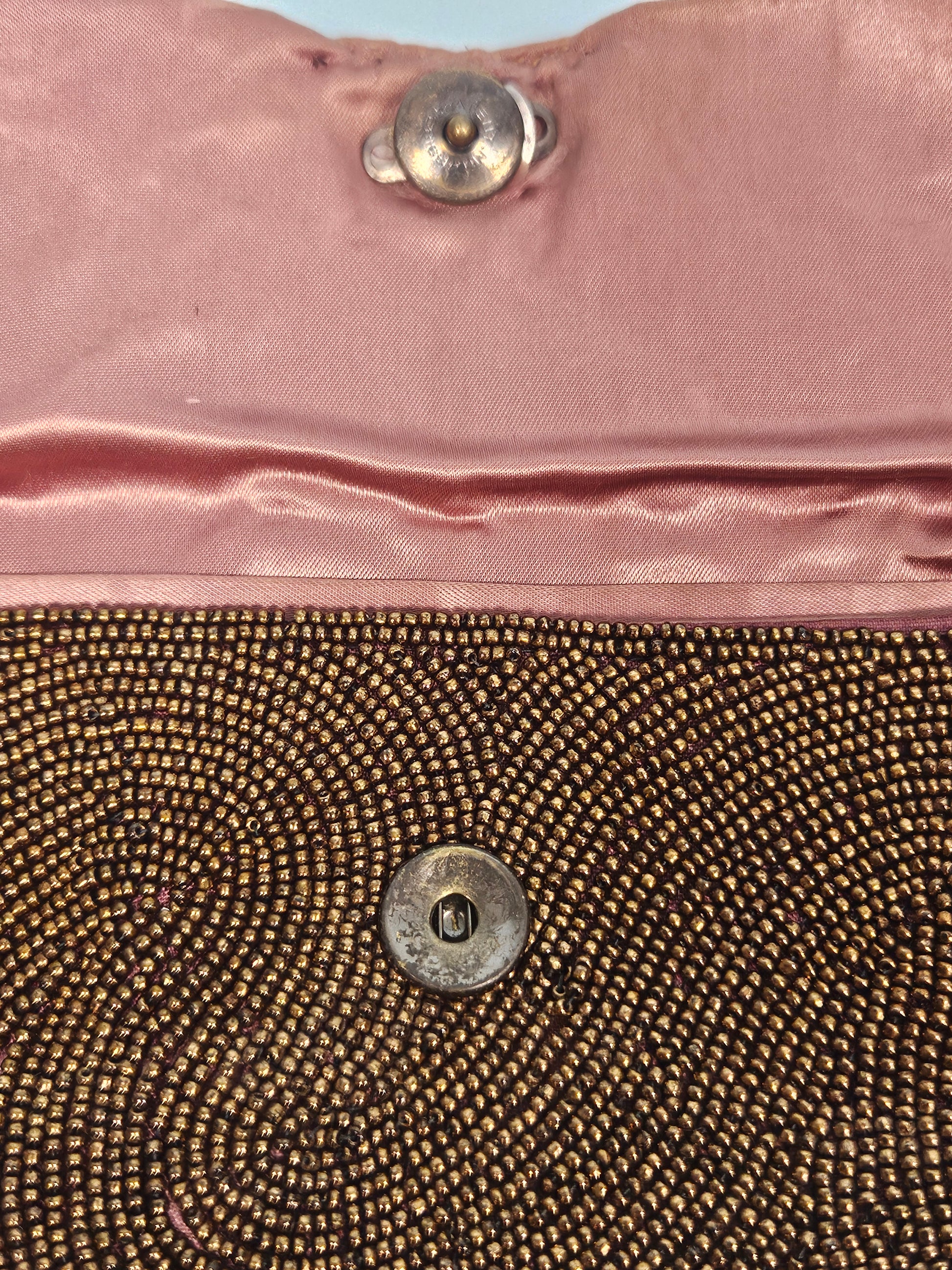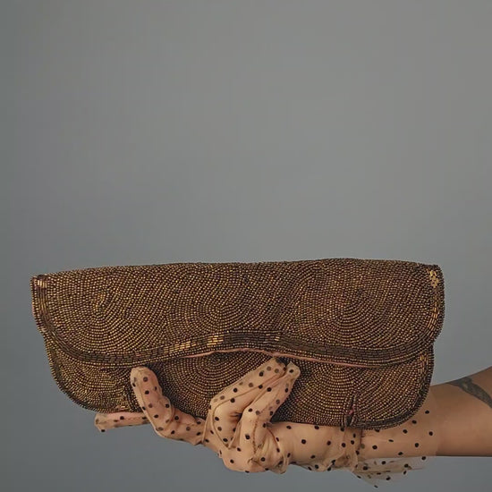 An exquisite example of mid-century glamour, this vintage 1950s “Josef” bronze beaded clutch is a true work of wearable art. Meticulously hand-beaded in warm bronze tones, the surface features intricate swirling patterns that catch the light with every movement, creating a rich, dimensional shimmer. The sculpted envelope silhouette and softly curved flap (with snap closure) give the bag a refined elegance that feels both classic and striking.