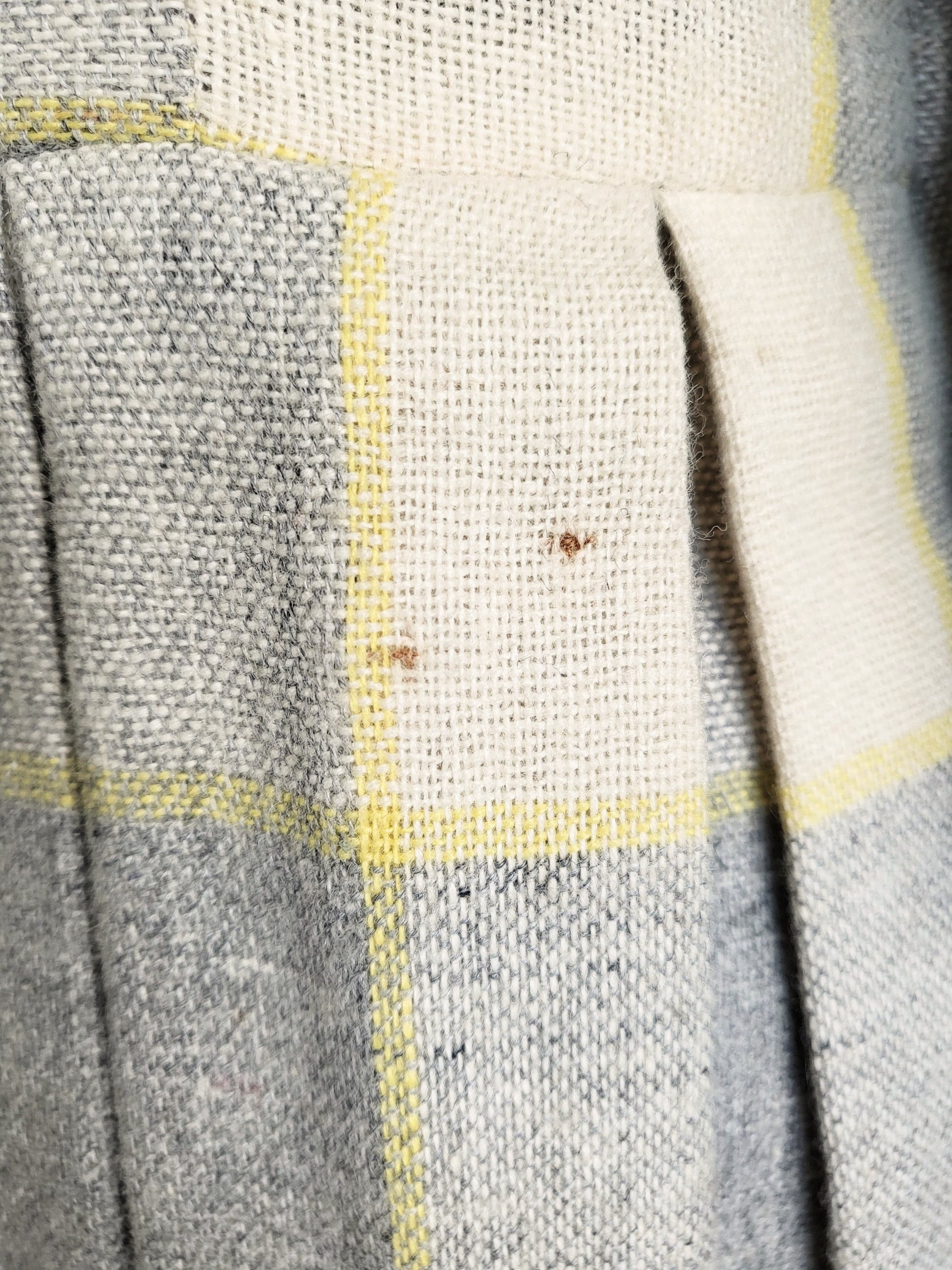 Condition notes: A few age-appropriate blemishes are present, including slight yellowing at the underarm area and two small brown dots on the front skirt panel. The garment has been laundered, and stain remover was applied to the brown spots without change; these may be inherent color variations within the wool rather than surface stains.