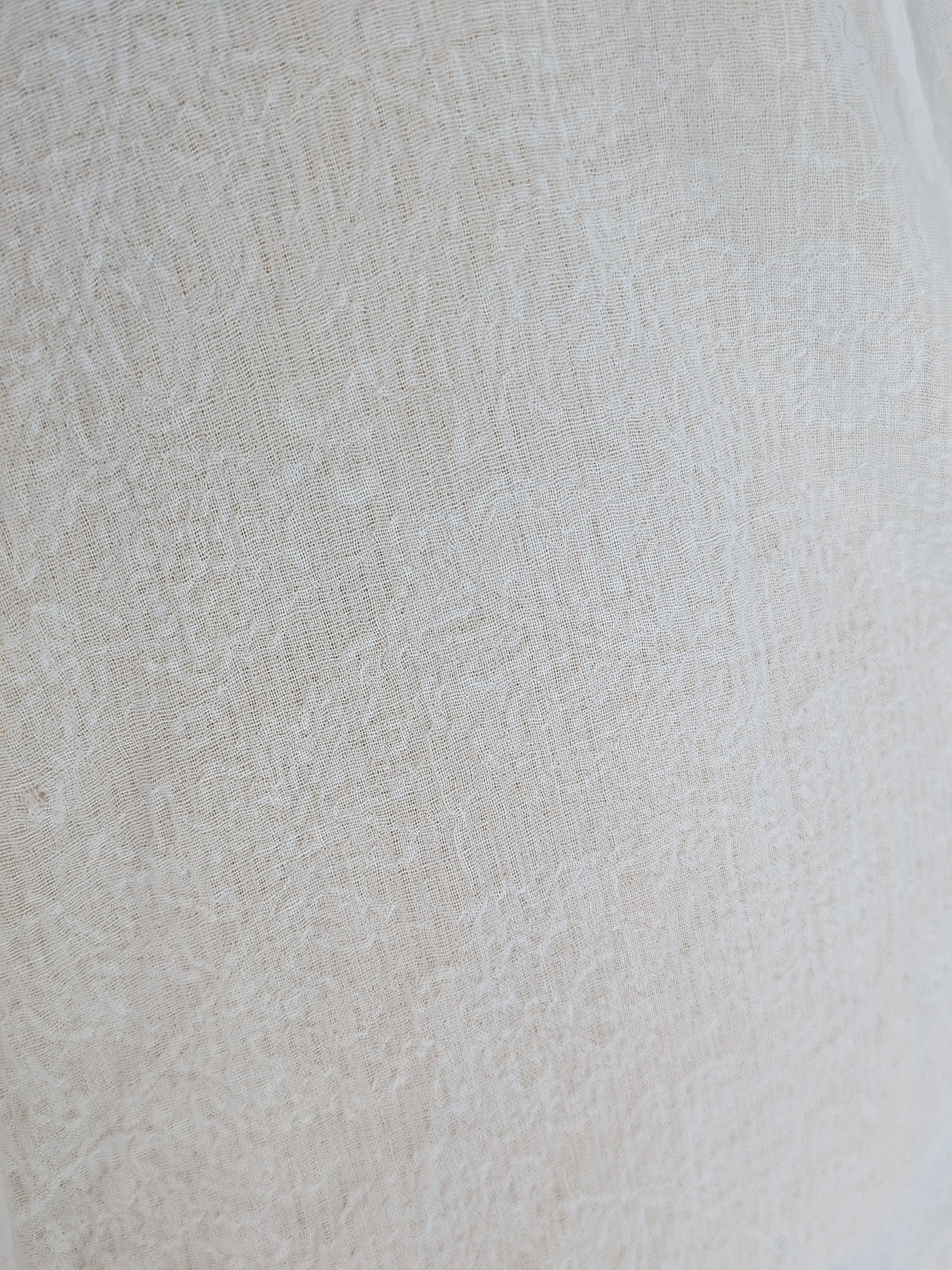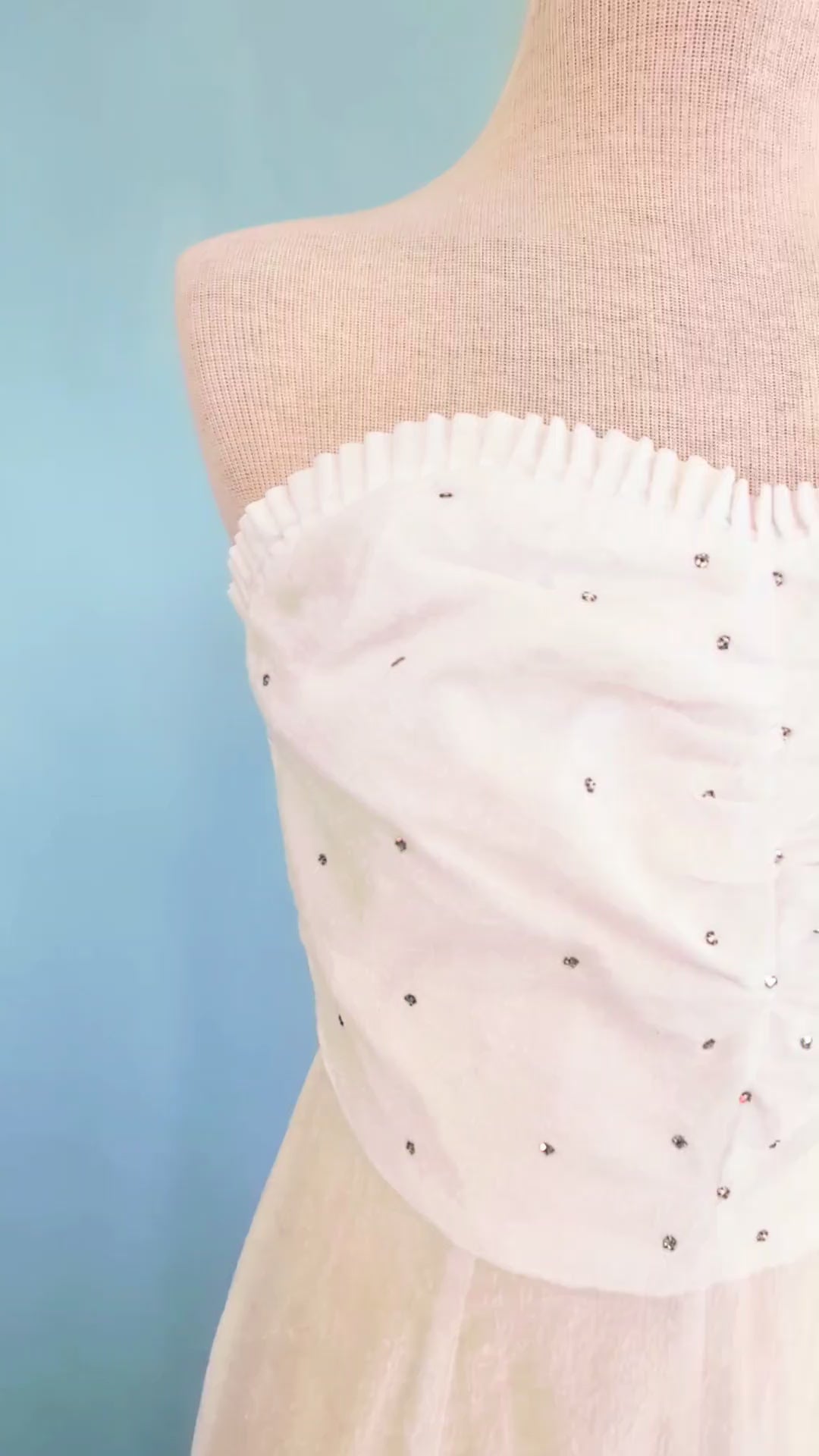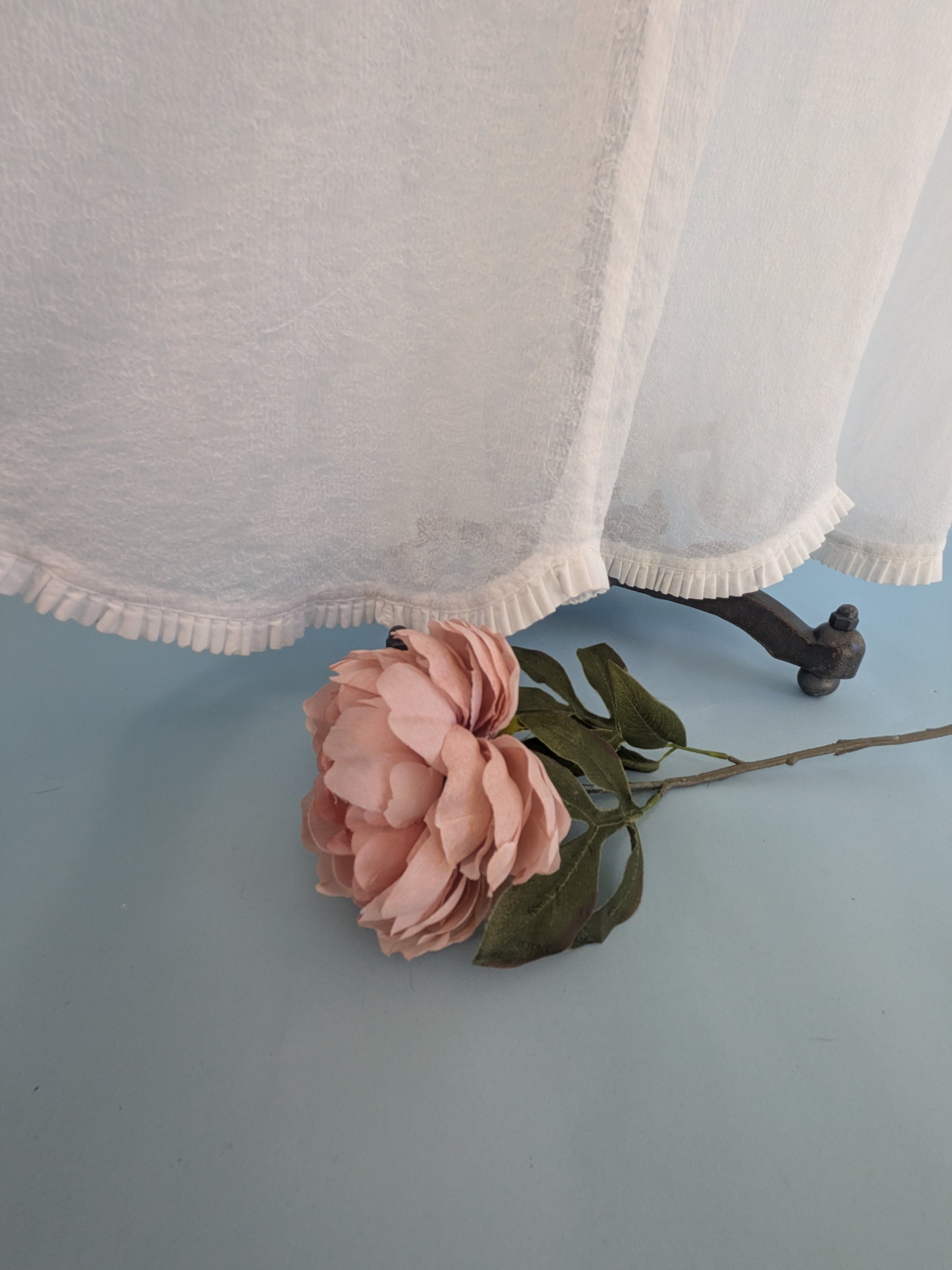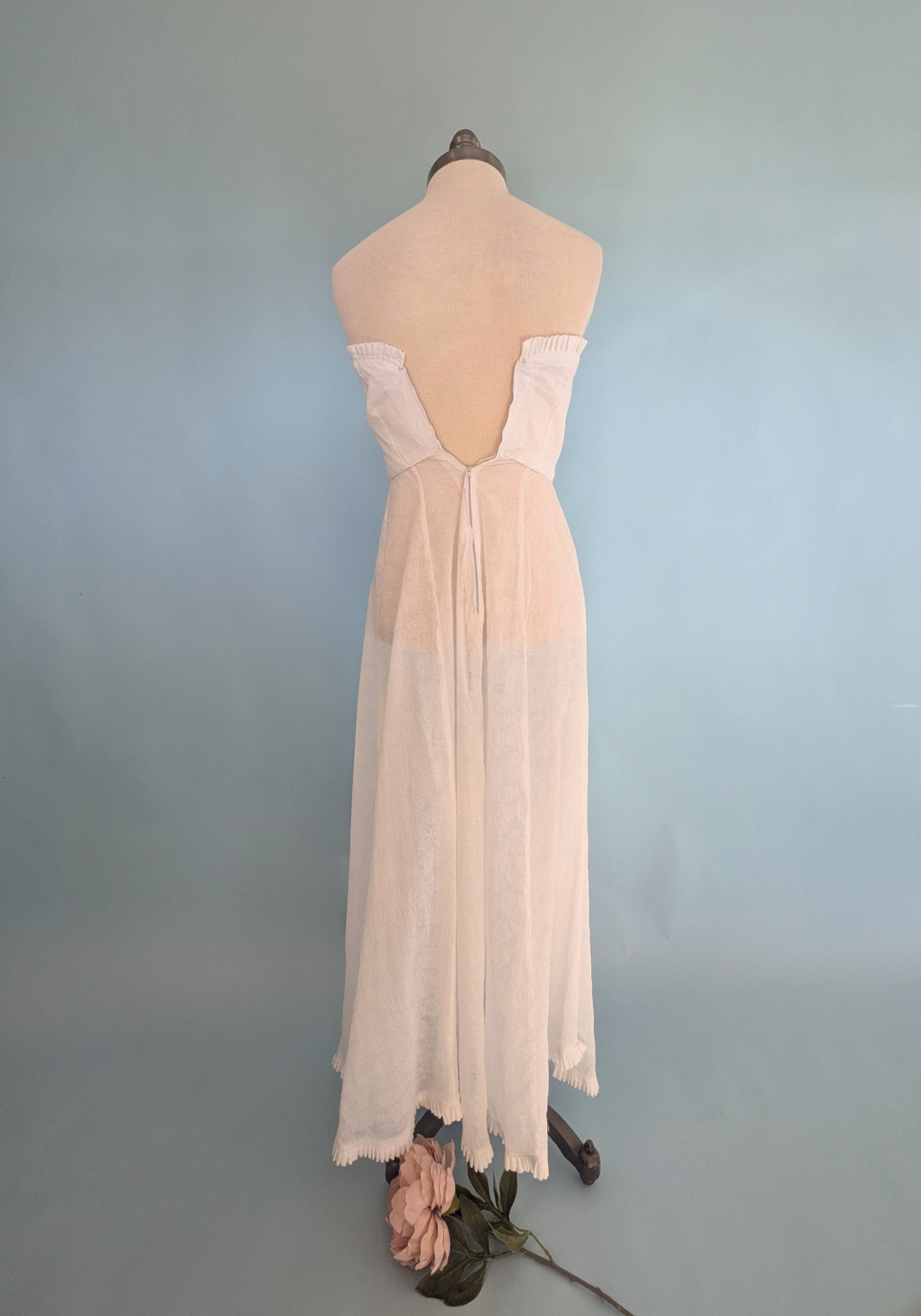 A beautifully romantic 1940s handmade white dress featuring a strapless silhouette with timeless vintage charm. The bodice is crafted from white botanical/floral embossed cotton gauze and delicately dotted with subtle rhinestones that catch the light without overpowering the design. Soft pleated ruffle trim finishes the top edge of the bodice and is echoed again along the hemline for a cohesive, ethereal look.