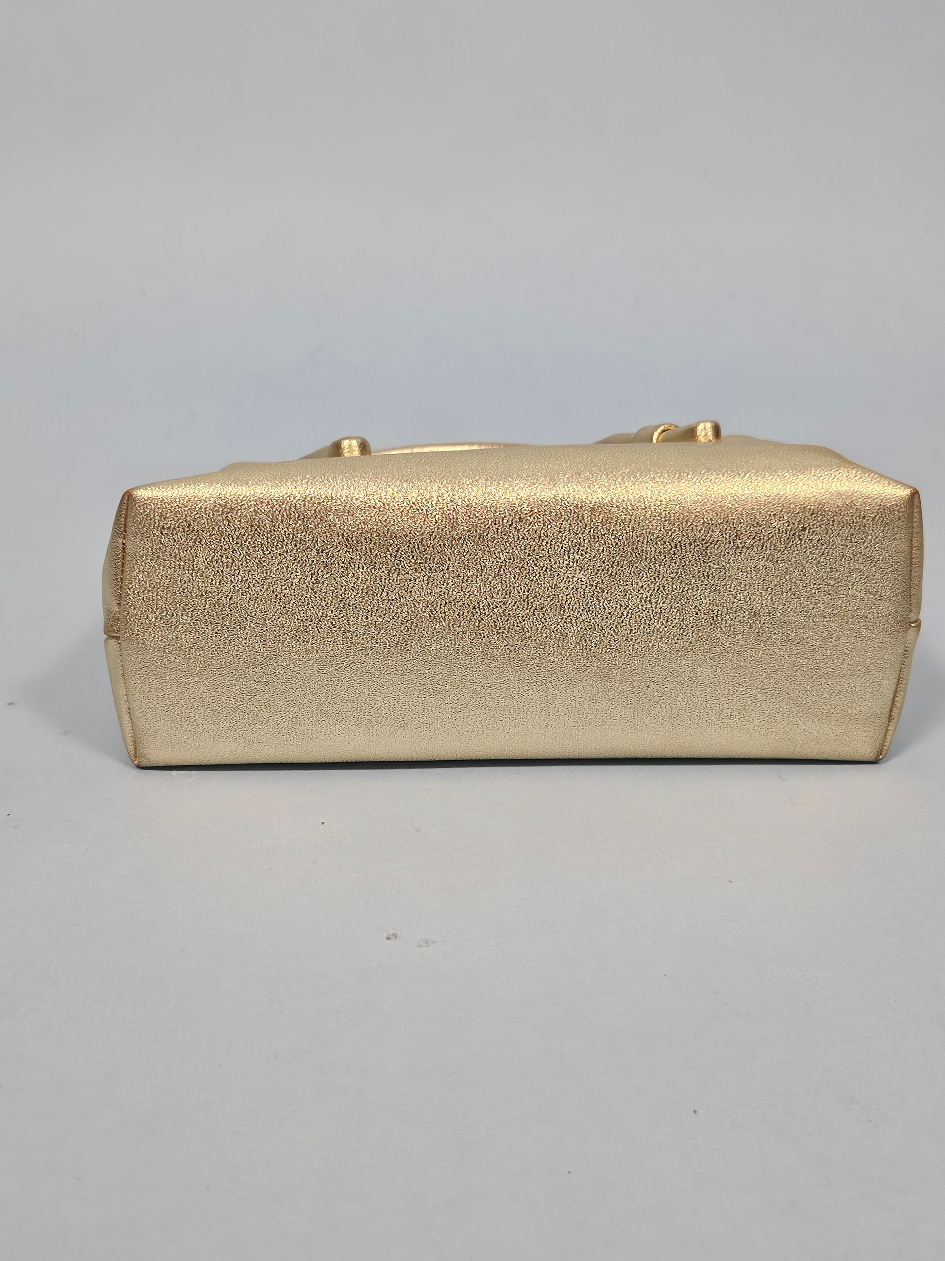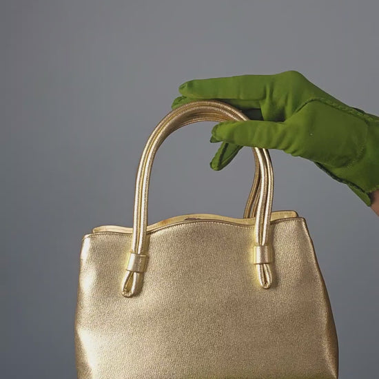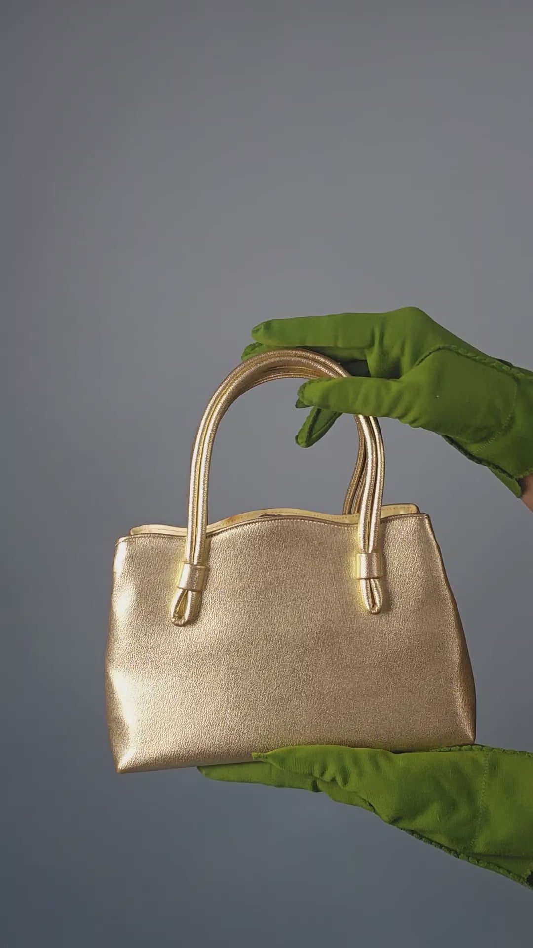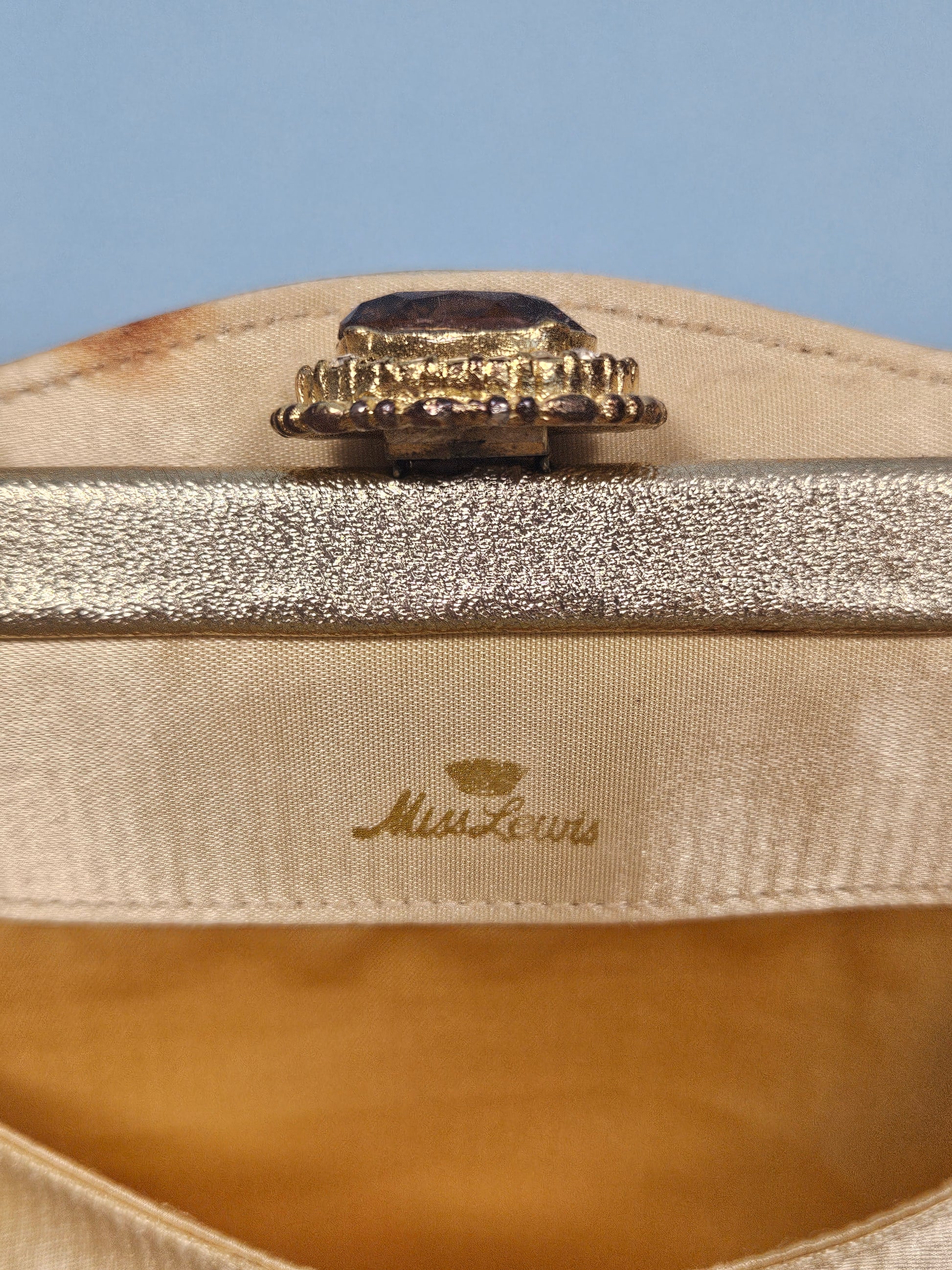 A luminous example of mid-century elegance, this vintage Miss Lewis handbag shimmers in rich gold lamé with a beautifully textured finish that catches the light from every angle. Structured yet softly refined, it embodies the glamour of the late 1950s–1960s cocktail era.