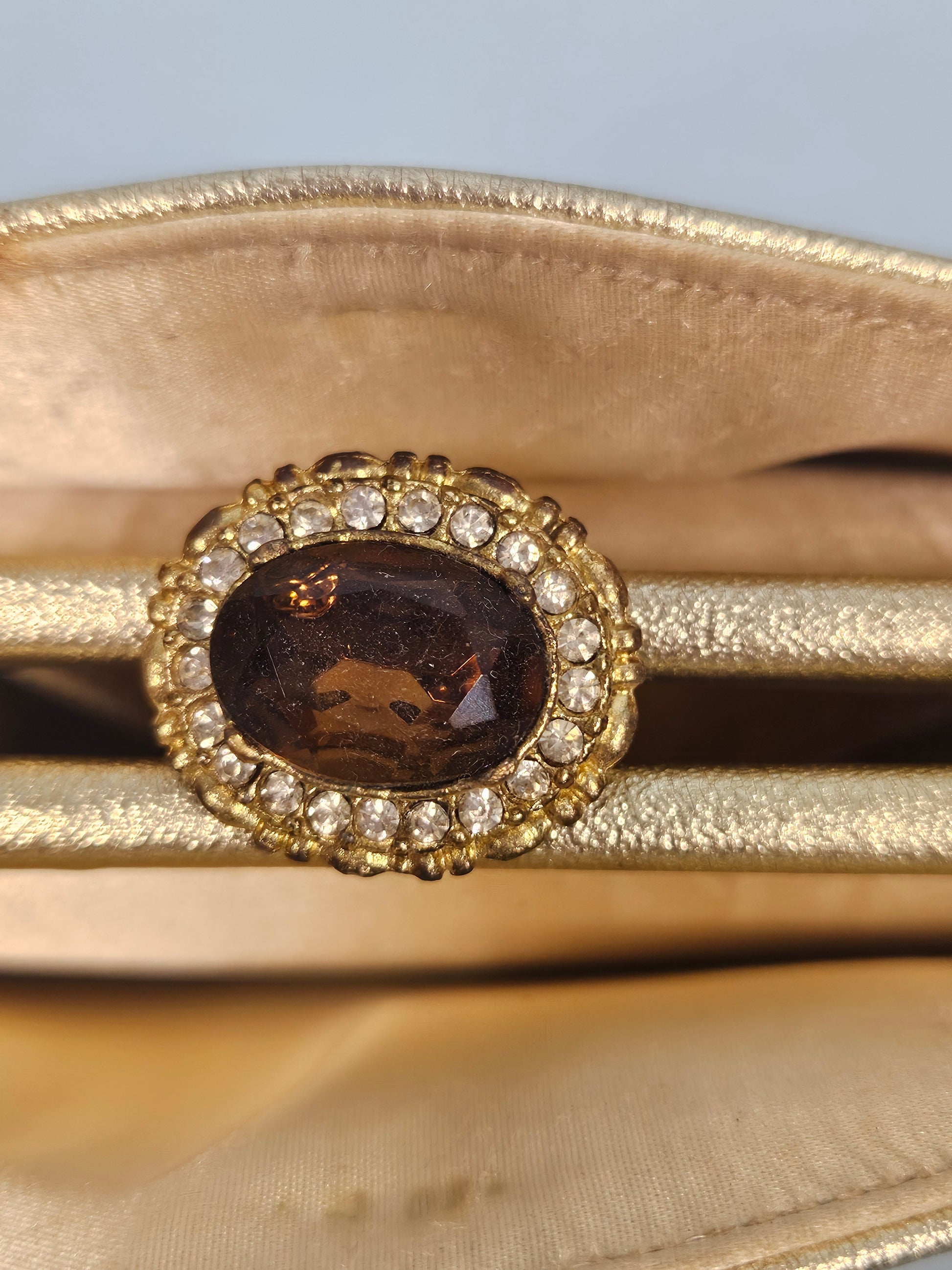 The bag opens to reveal a luxurious golden champagne satin lining, smooth and radiant, with a convenient inner open pocket for small essentials. A striking amber-tone stone and crystal rhinestone clasp crowns the design, adding a warm jewel accent that feels both sculptural and timeless. Finished with graceful top handles, this piece is perfectly sized for evenings out, special occasions, or elevating a day look with unmistakable vintage charm.