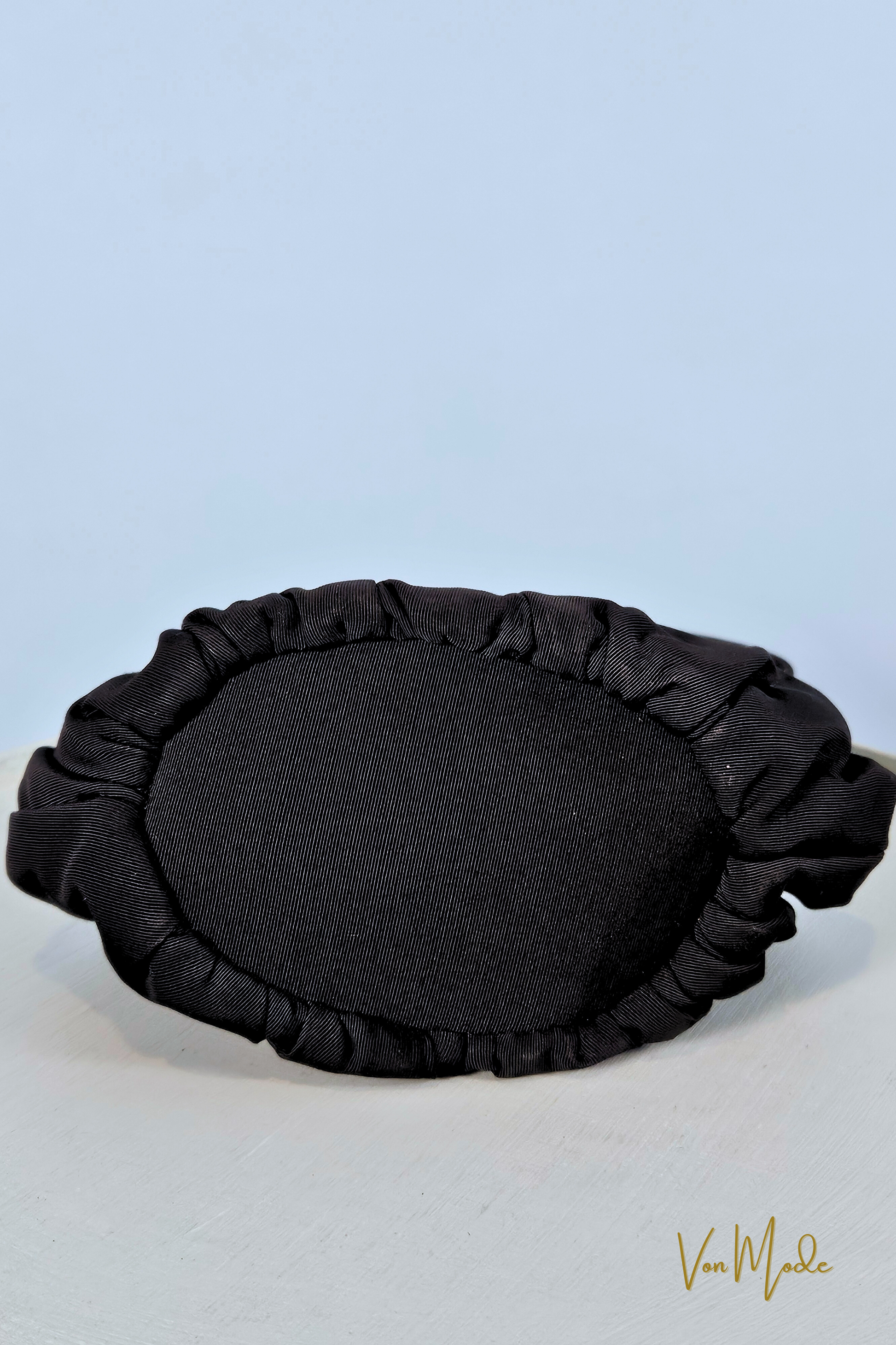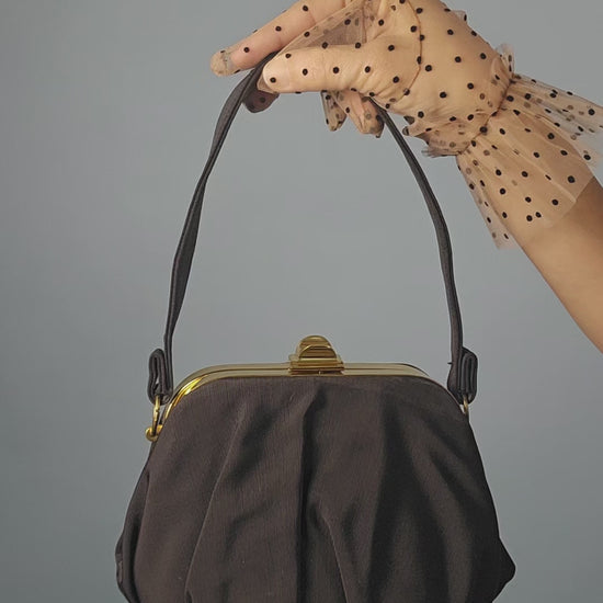A beautifully sculpted example of mid-century elegance, this authentic 1950s Fabrique handbag features a charming gumdrop silhouette with a refined, structured form. Crafted in black silky bengaline, the fabric has a subtle sheen and soft ribbed texture that was highly prized in the era for its durability and polish.