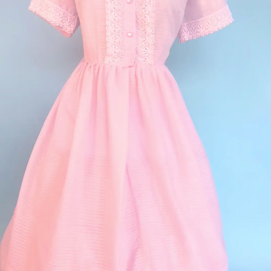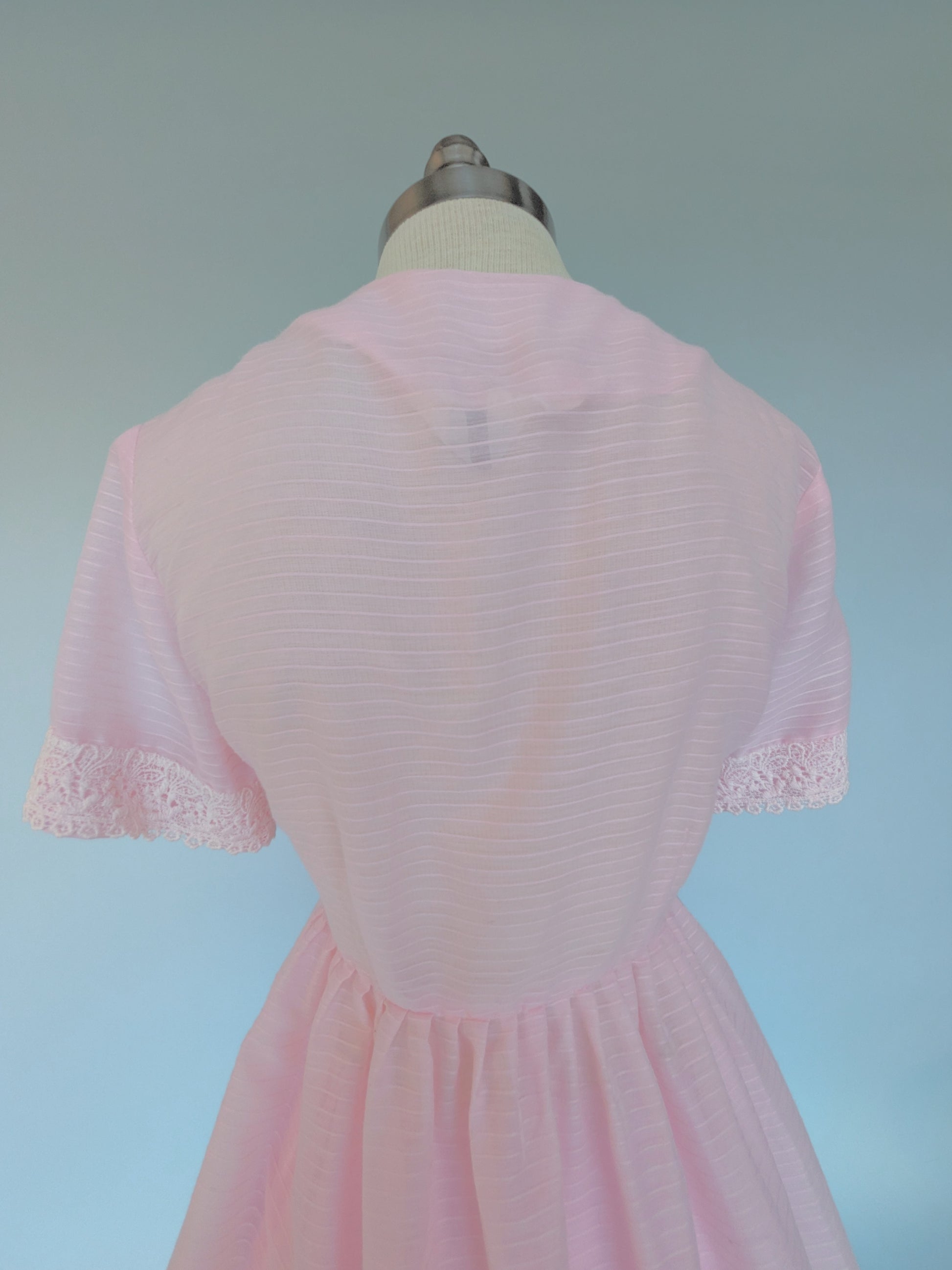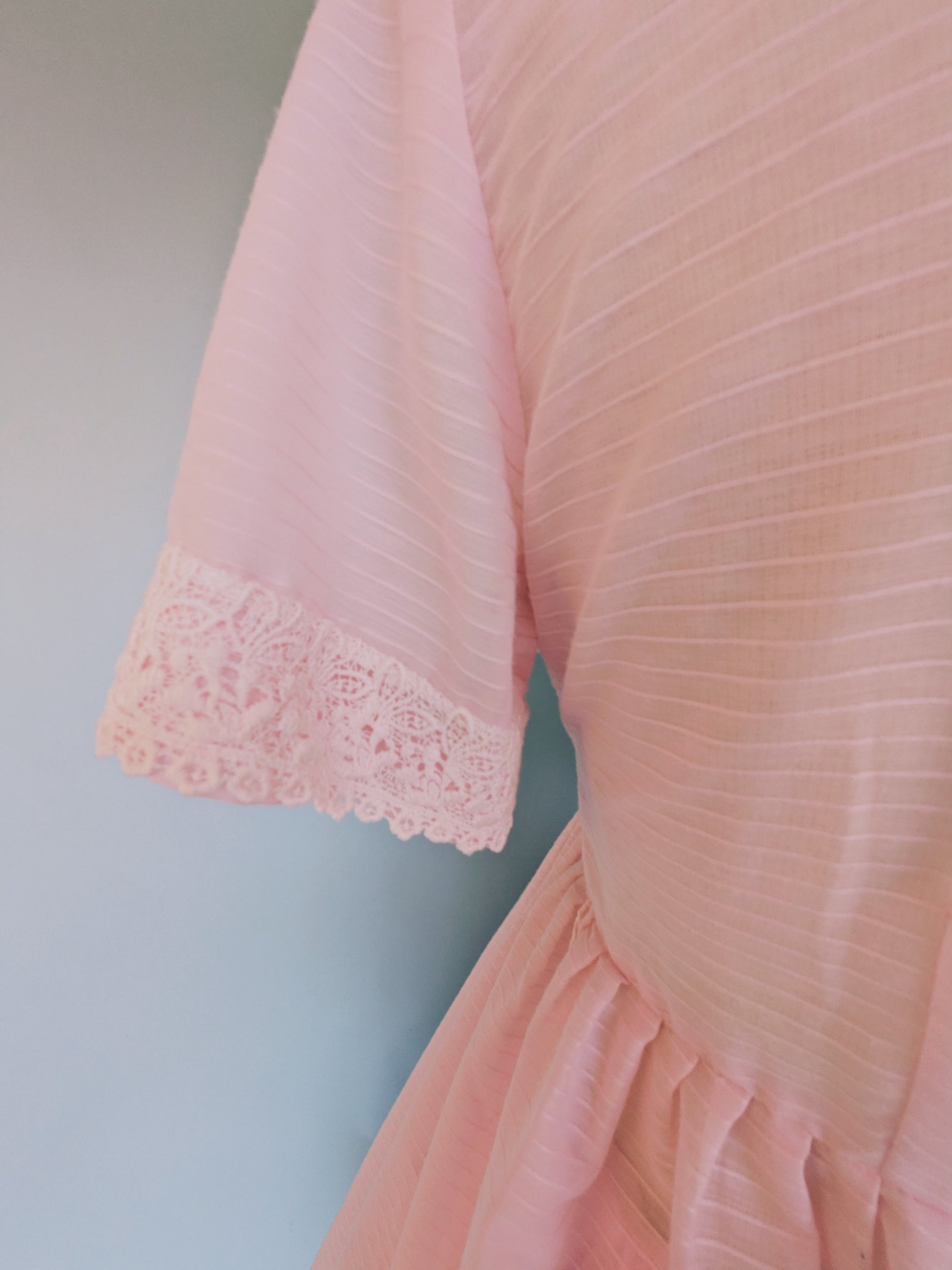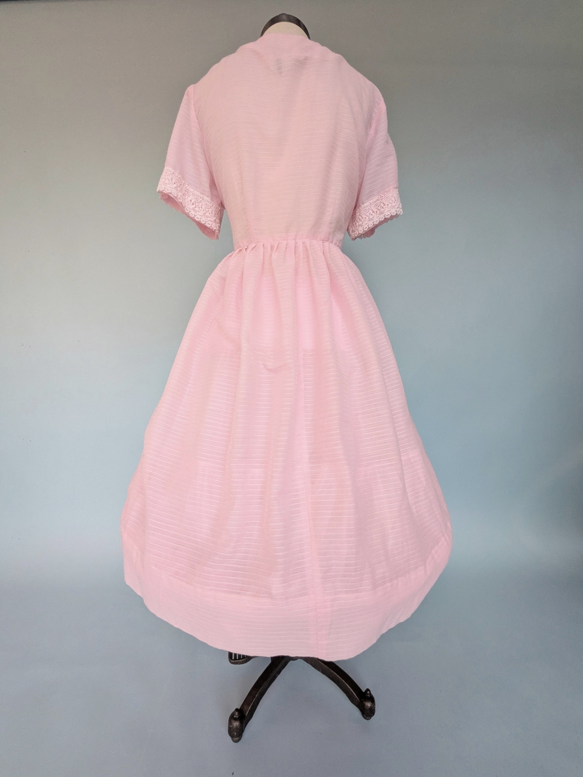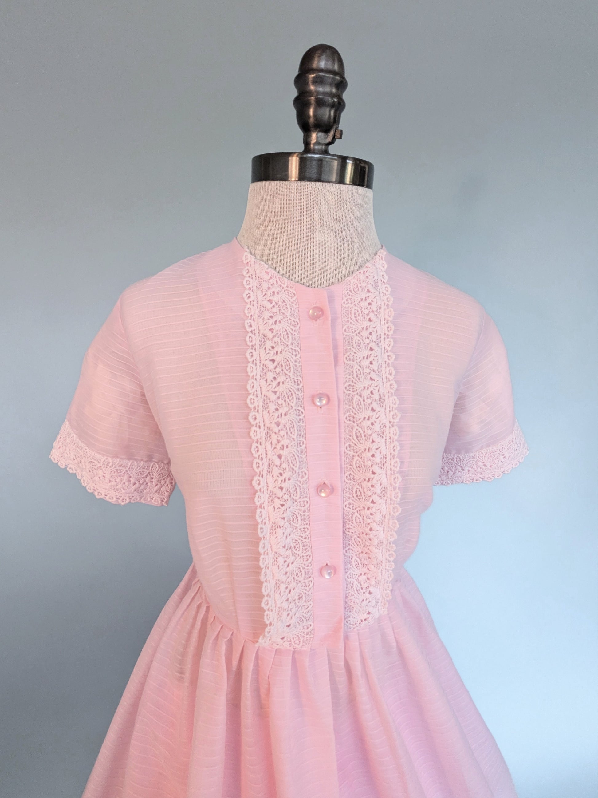 This nearly perfect pale bubblegum-pink sheer ribbed cotton day dress by Sherry Kent of Dallas is pure sweet-as-sugar vintage delight. Delicate crocheted lace trim dances along the sleeves and bodice, adding just the right touch of romance. A few of the original buttons had gone missing and the remaining pair showed some wear, so we gave this beauty a thoughtful refresh—replacing all of the buttons with vintage (1980s) full-shank plastic buttons in the same dreamy pink hue. For a little extra peace of mind, we even tucked in a hidden spare button at the waistline.