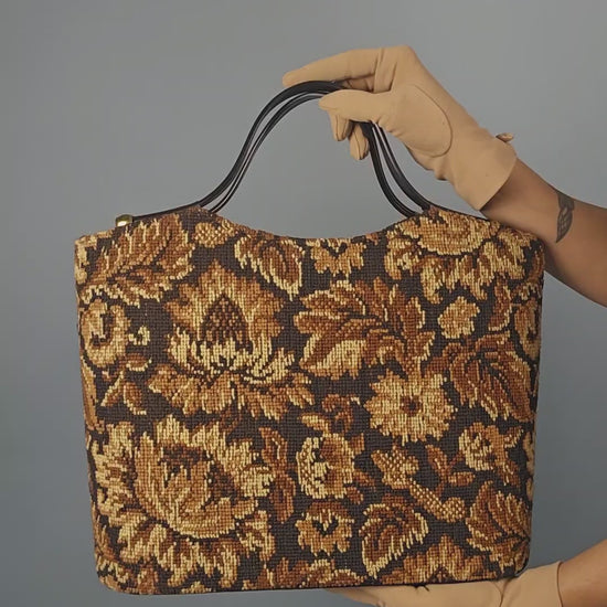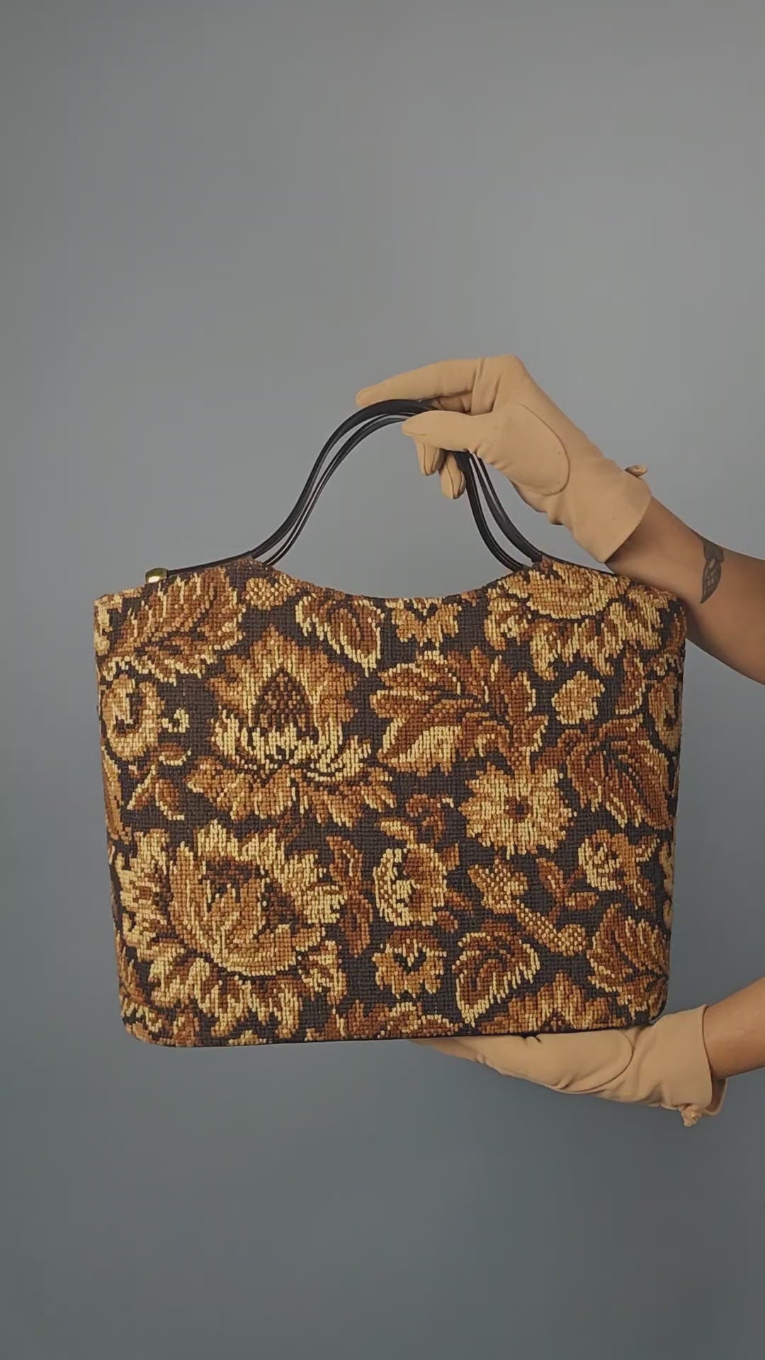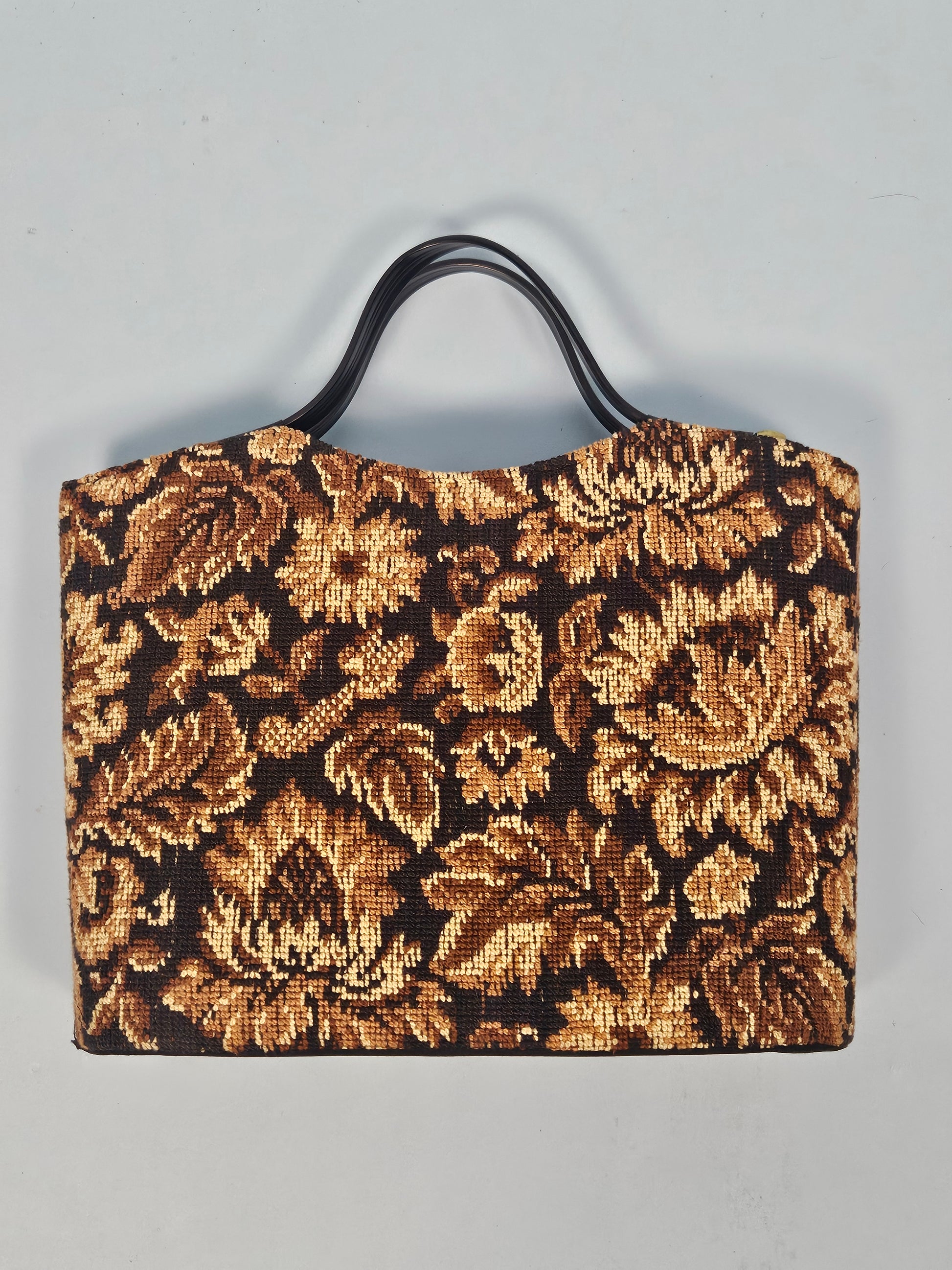 Warm, richly textured, and undeniably 1960s, this autumnal carpet tapestry handbag is a true statement piece of vintage artistry. Woven in a lush palette of harvest tones—burnt orange, deep rust, golden ochre, moss green, and earthy brown—the tapestry design evokes the cozy elegance of fall with a hint of bohemian sophistication.