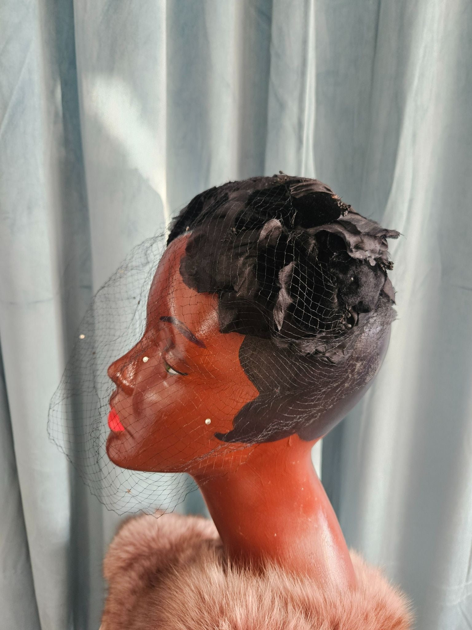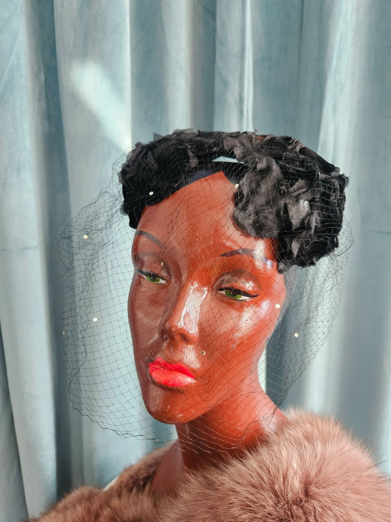 Vintage 1950's "Bettine for The May Co."Black Velvet and Silk Floral Crescent Topper