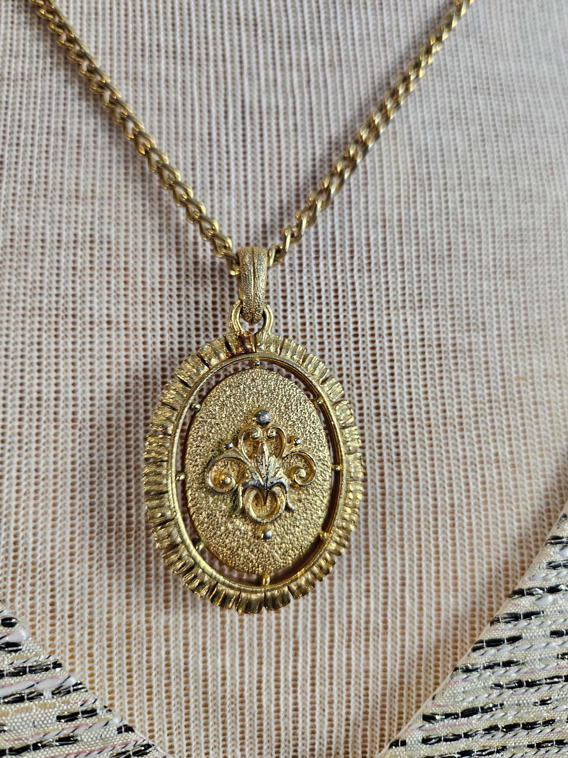 A timeless treasure with old-world elegance, this vintage double-sided cameo pendant offers beauty from every angle. One side features a classic white-on-coral cameo portrait, delicately carved in profile and framed by a richly textured gold-tone oval setting with scalloped detailing. The reverse reveals an ornate fleur-de-lis motif, adding a regal touch and making this piece truly special.