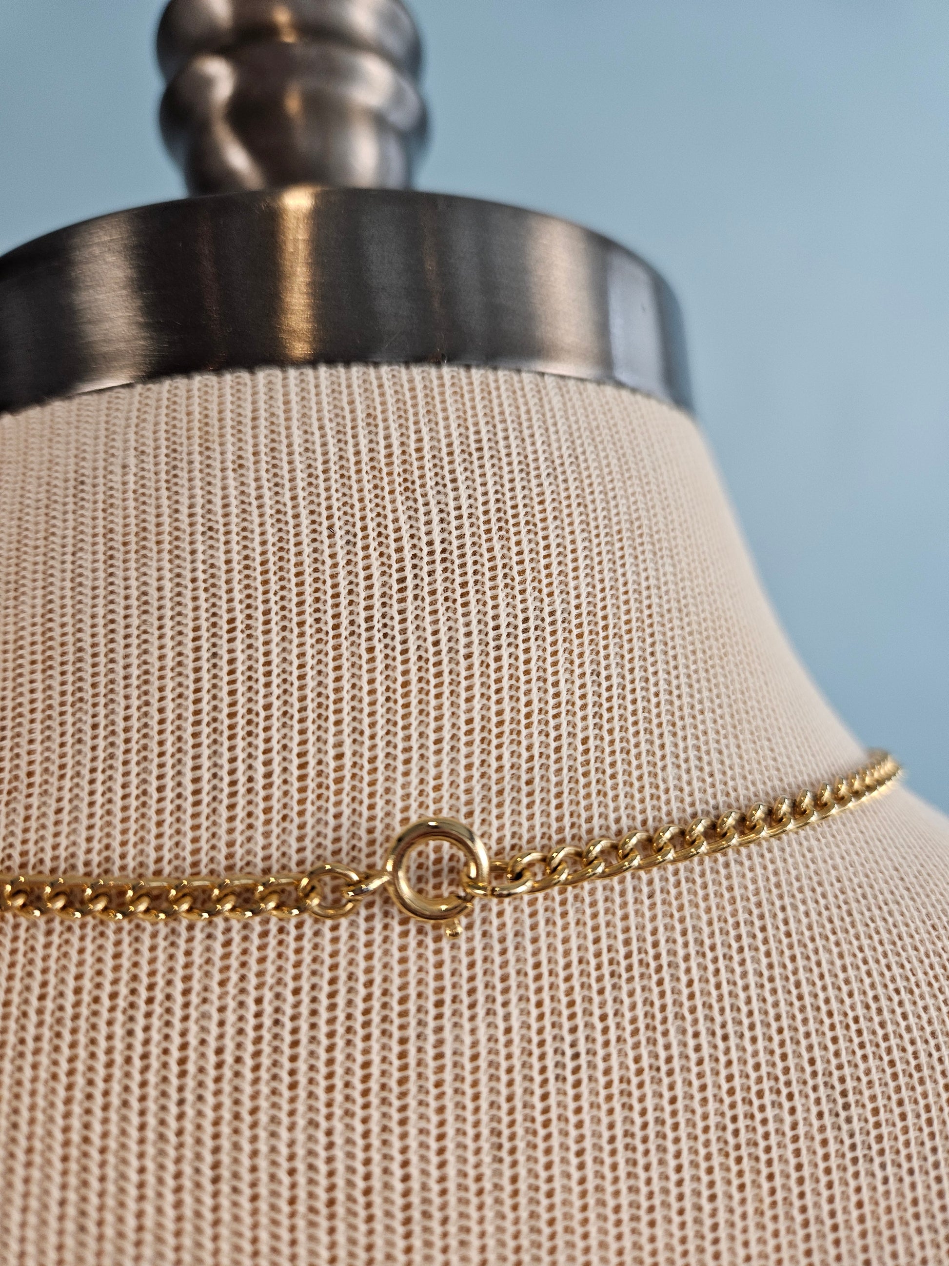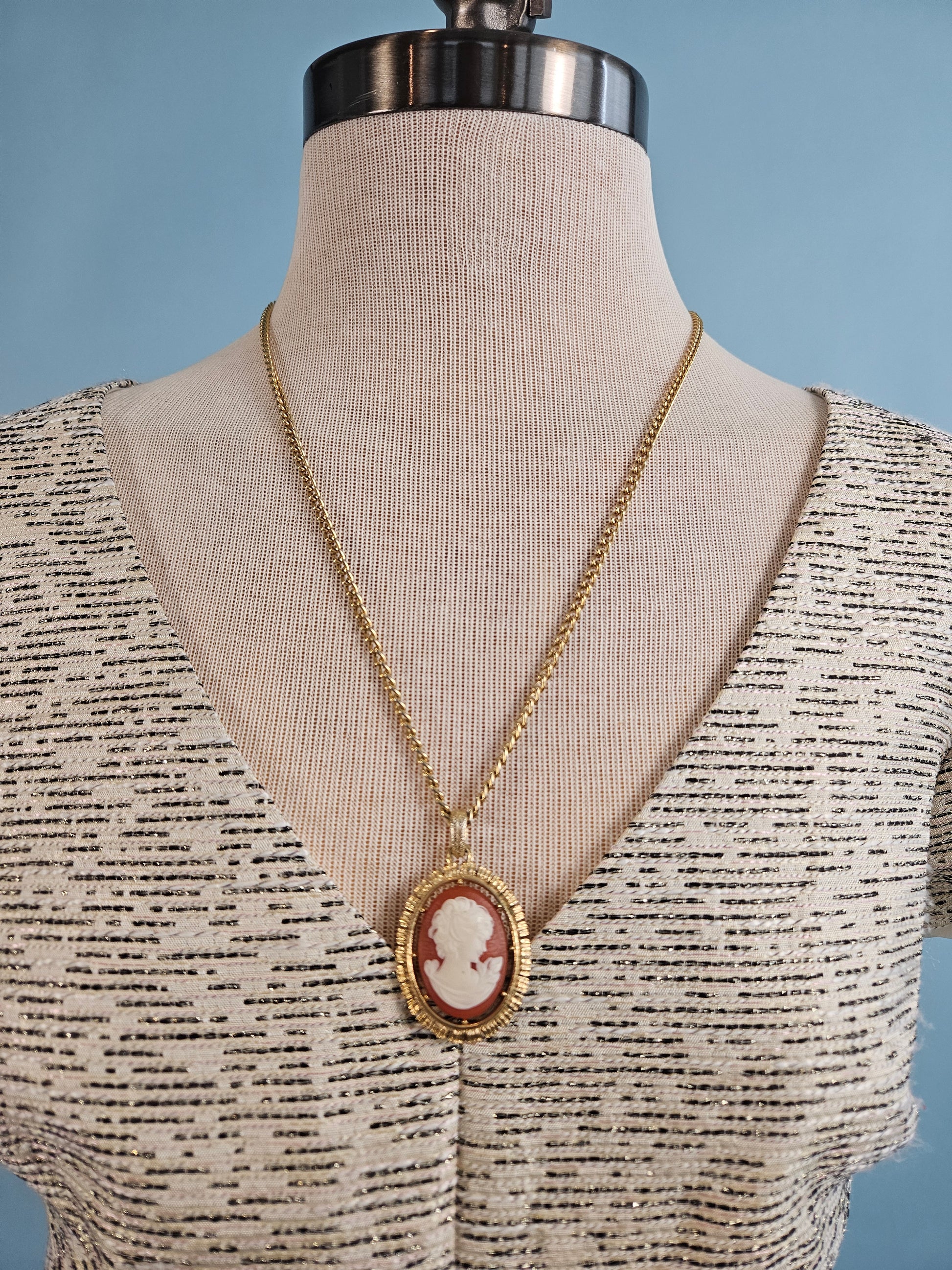 Suspended from a coordinating gold-tone chain, this necklace effortlessly blends Victorian revival romance with mid-century charm. The reversible design allows for versatile styling—wear the cameo side for soft, romantic looks or flip to the decorative back for a bold, antique-inspired statement.