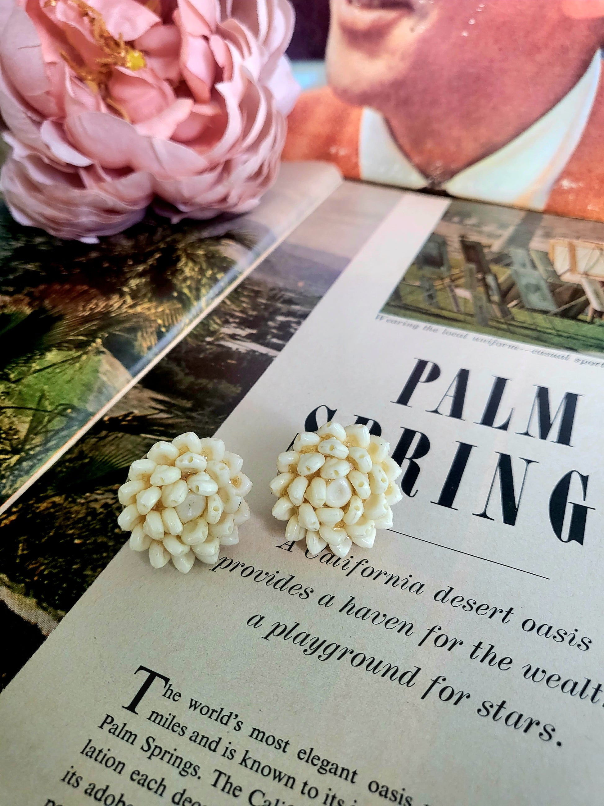 Vintage Large Ivory Lotus Flower Beaded Studs (Screw Post)