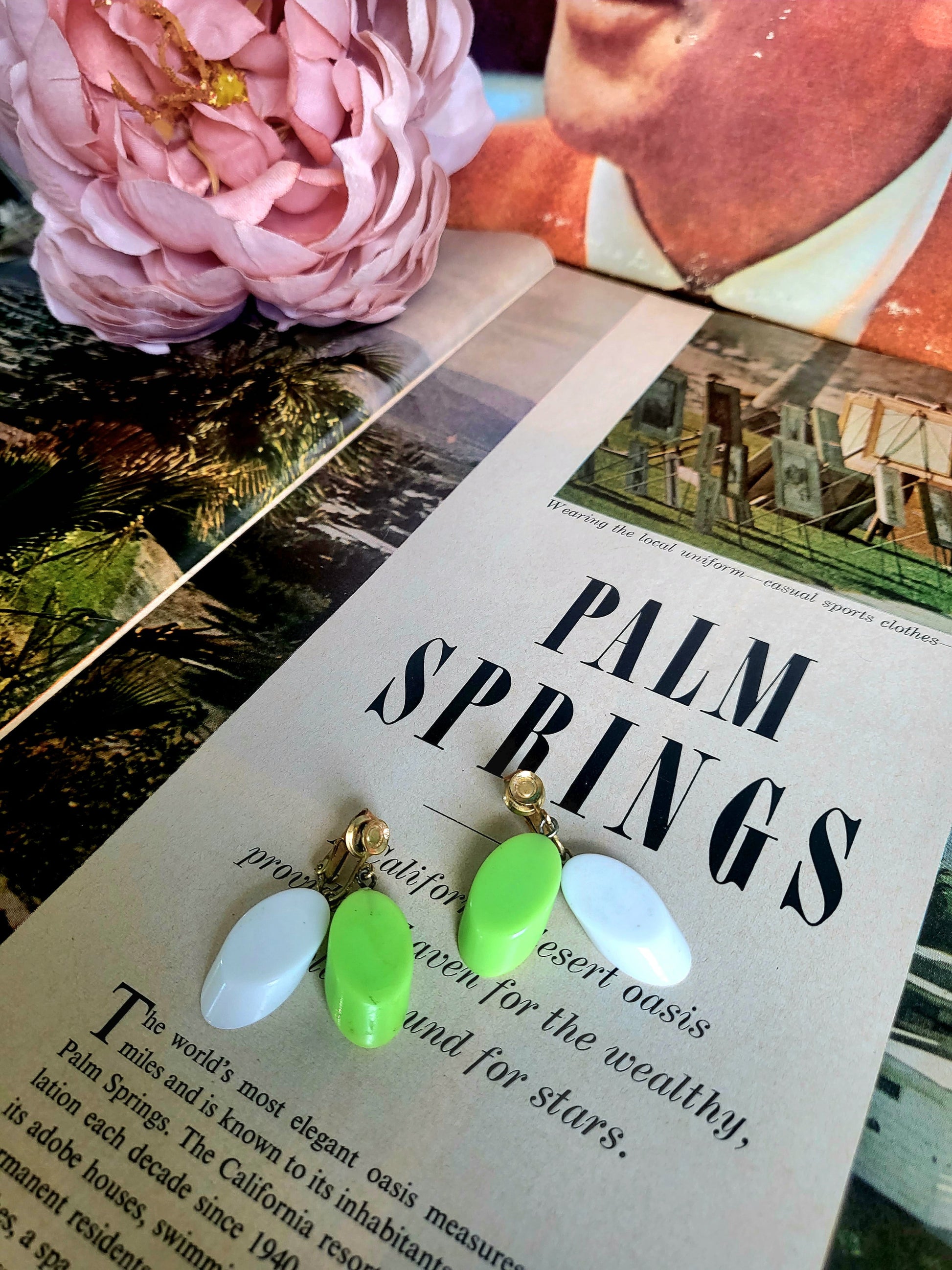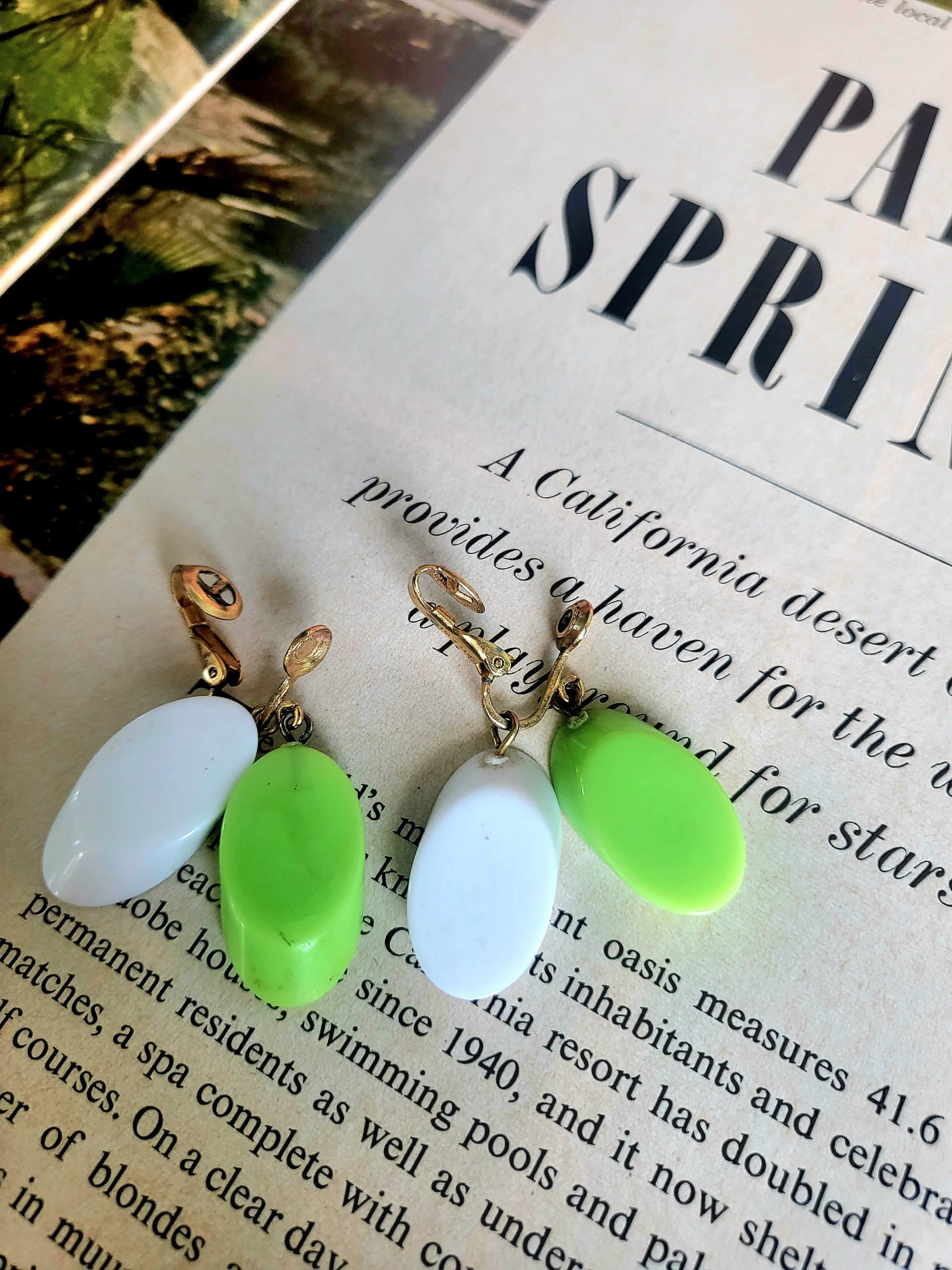Vintage White and Lime Green Mod Oval Dangle Earrings (Clip-on)